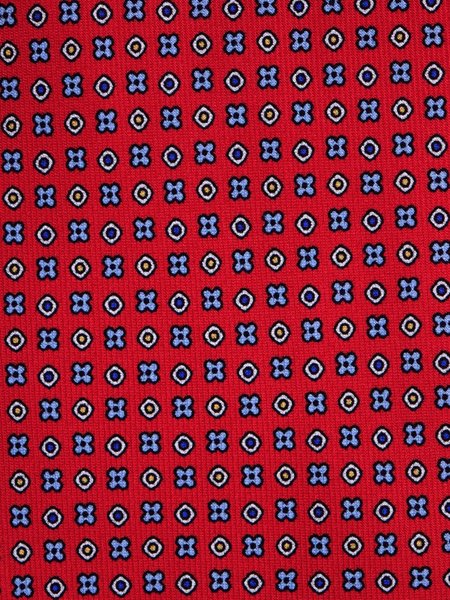 An authentic investment in timeless elegance for the true gentleman's wardrobe. This Don Mimì 3 fold tie, made in prestigious English printed silk, represents the absolute excellence of the tailoring tradition. The vibrant red background, embellished with a rigorous and classic geometric micro-pattern in shades of blue, confers a status of unequaled class. Its light and fluid texture makes it the perfect masterpiece to stand out with authority and refinement throughout the spring and summer season.