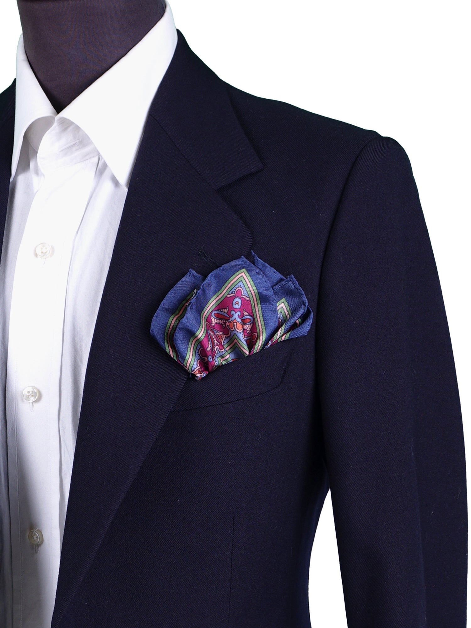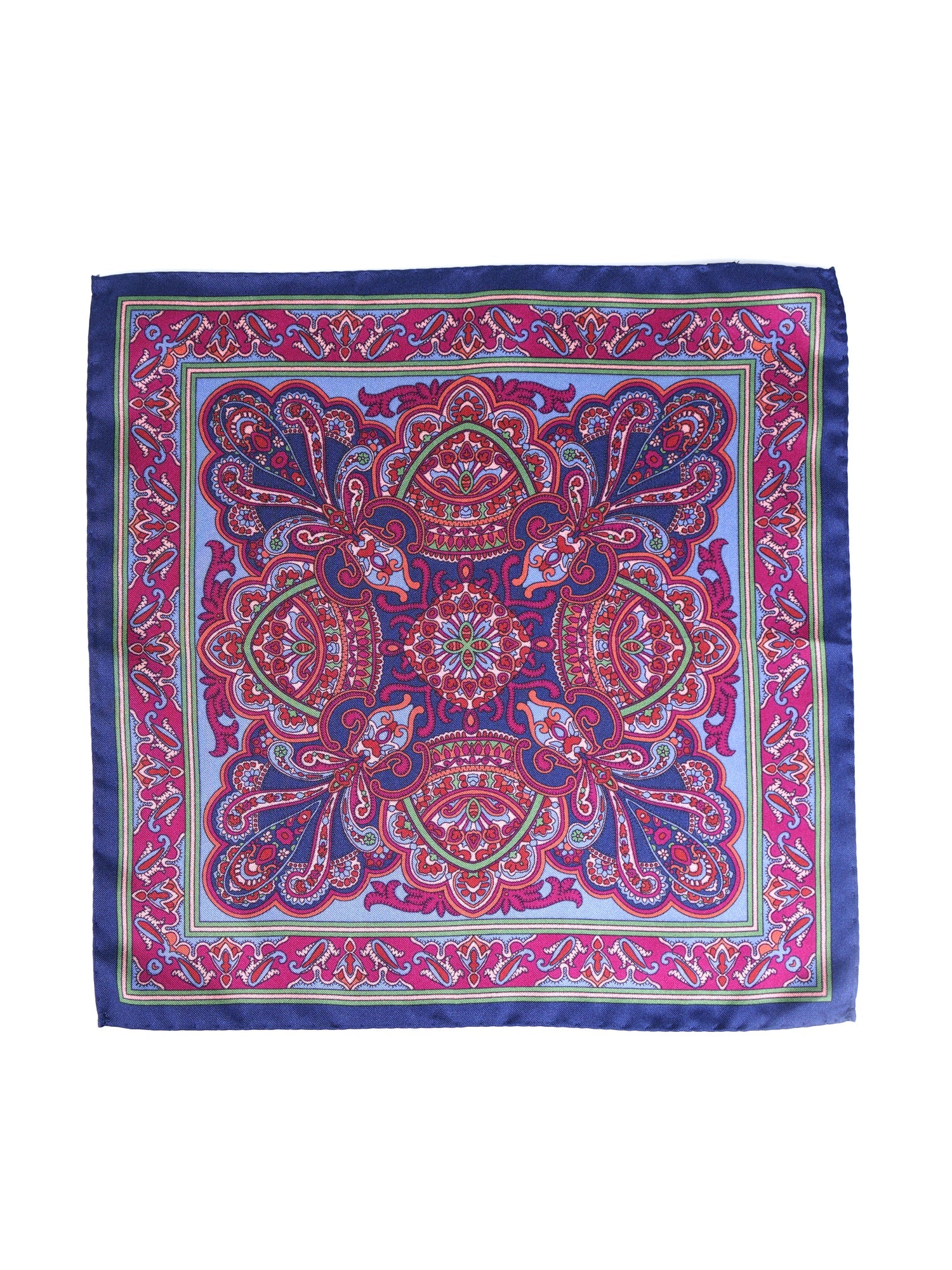 An accessory that is an explosion of color and art, designed for the man who is not afraid to dare with style and sophistication. This pocket square is made from pure Italian printed silk, with vibrant shine and a soft, slippery hand. Its design is a sumptuous interpretation of the iconic Paisley motif, in a bold color palette that combines jewel tones like royal blue, fuchsia, orange, and green. It is the perfect piece for the man who uses accessories to define his style and communicate his personality.