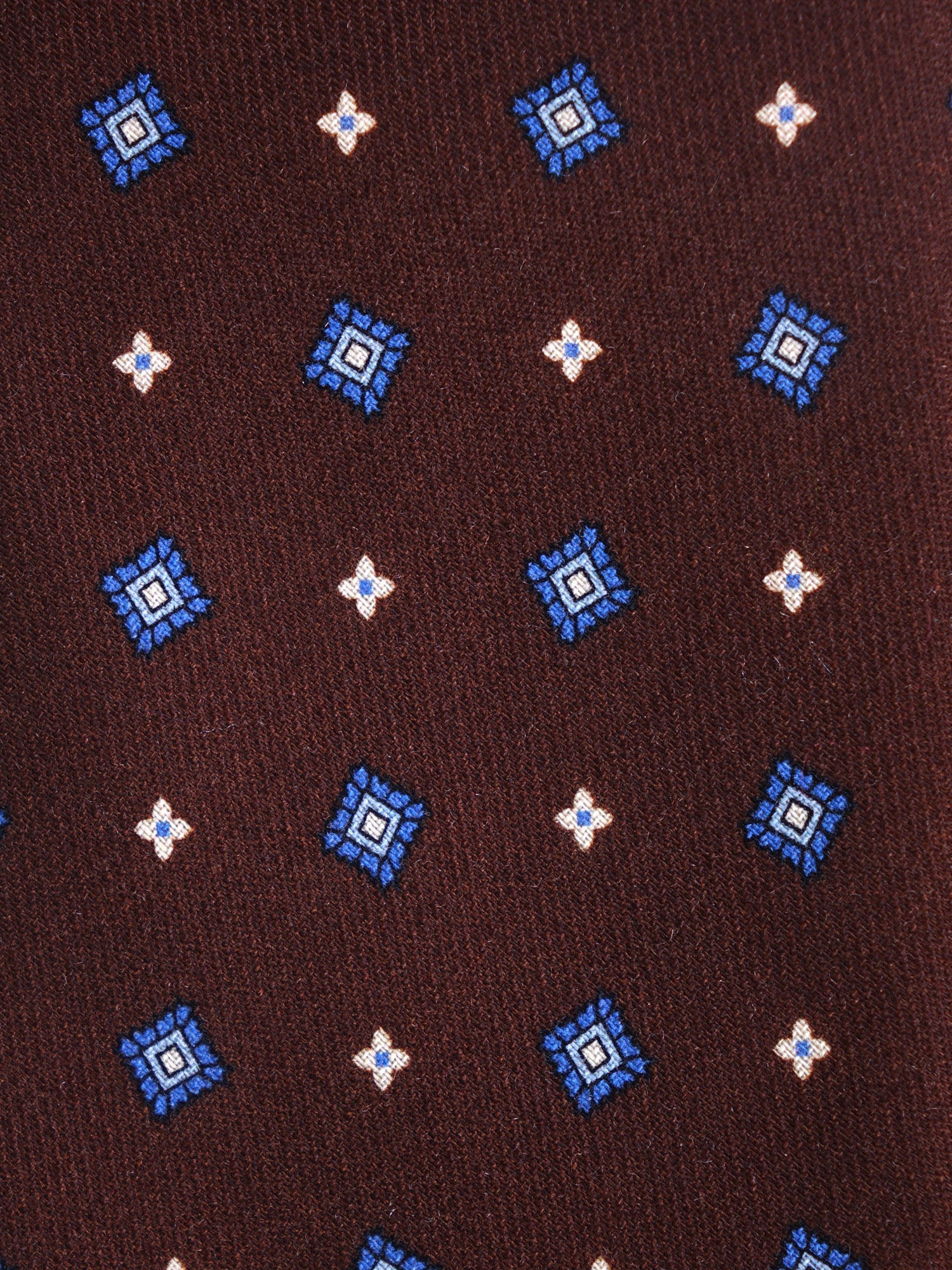 A masterpiece of softness and "Old Money" style. This Don Mimì tie is made of fine English Challis wool, an iconic fabric for its soft, light feel and impeccable drape. The warm and enveloping chocolate brown base is punctuated by refined blue and white geometric motifs that add light without compromising the sobriety of the whole. It is the accessory of choice for the professional who knows the value of authentic materials and prefers a mature, cultured, and reassuring elegance.