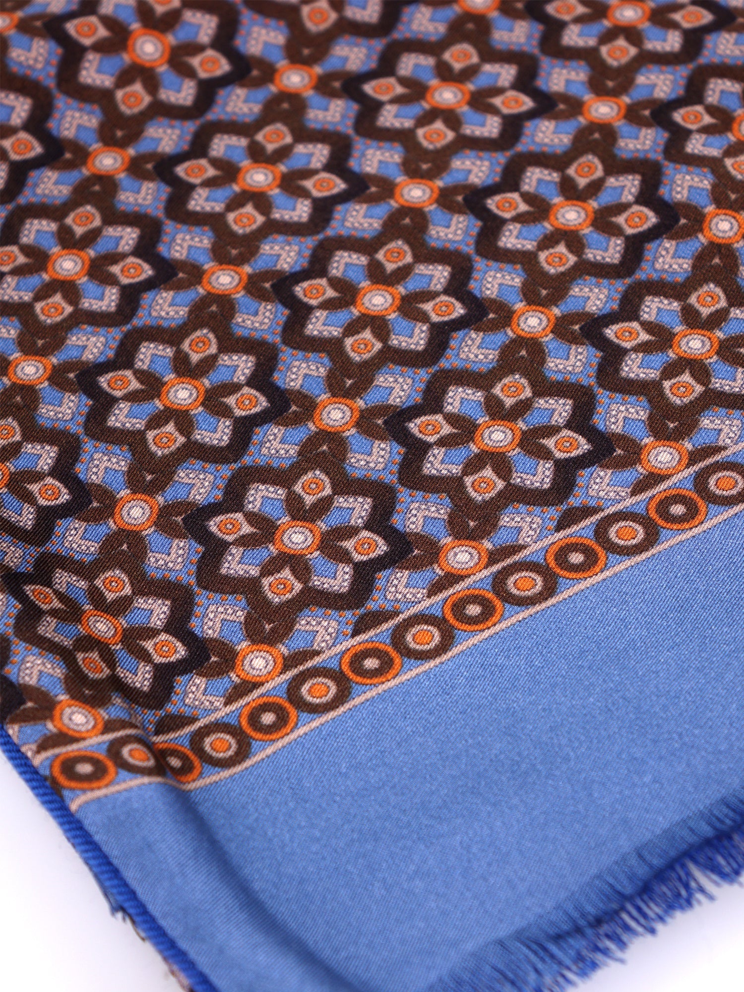 An investment in timeless elegance, designed for the gentleman who demands excellence even in functional details. This "double-sided" tubular scarf represents the perfect synthesis between the sophisticated aesthetic of printed silk and the enveloping warmth of the inner wool. The geometric pattern on a brown background, illuminated by light blue and orange accents, confers a decisive yet never ostentatious character, evoking that sartorial rigor typical of Italian "Bespoke". A prestigious accessory, capable of instantly elevating the status of the wearer.