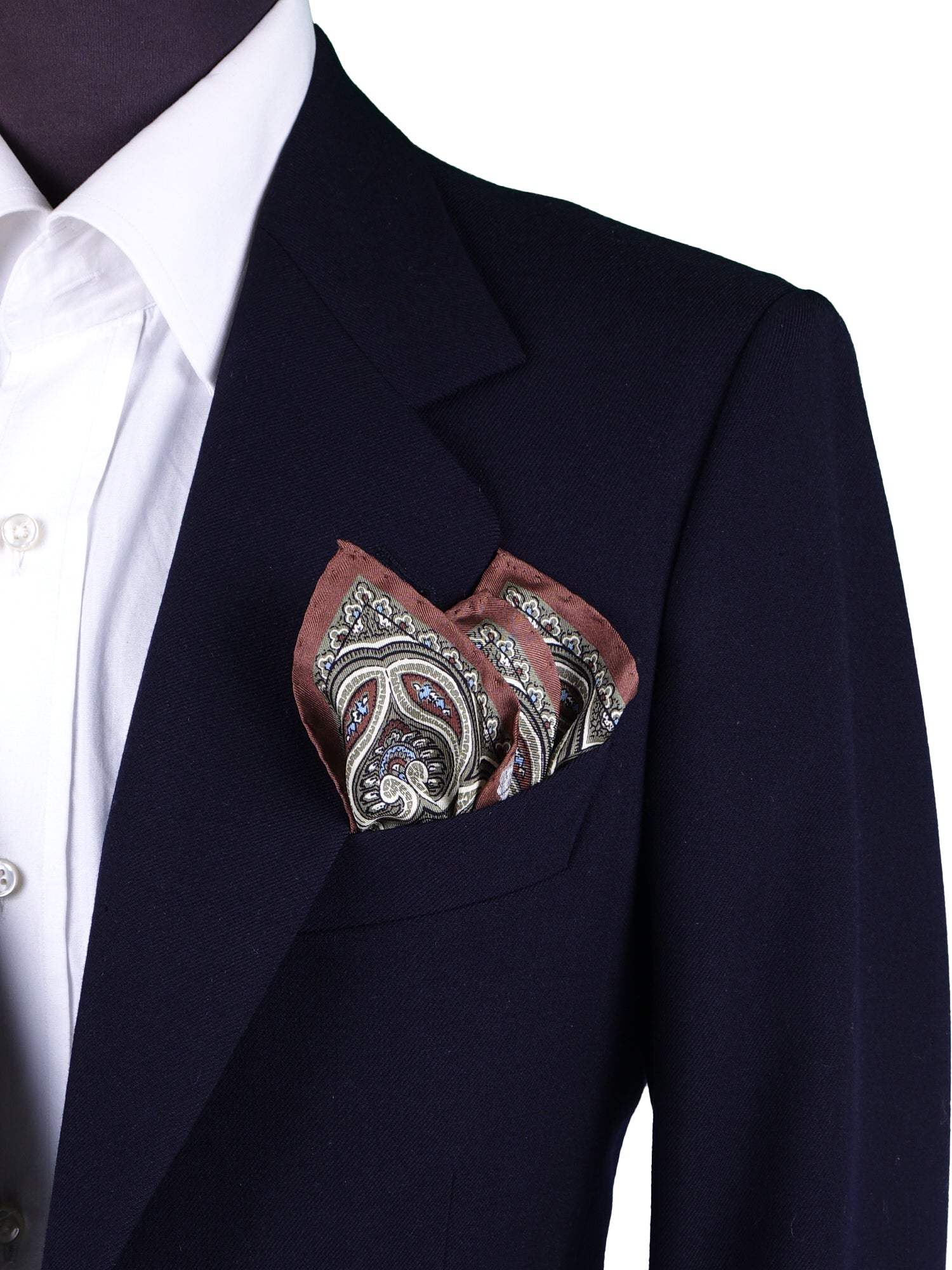 - How to Fold: A "crown fold" that reveals different points in an seemingly casual manner, showcasing both the sober blue center and the vibrant paisley border.