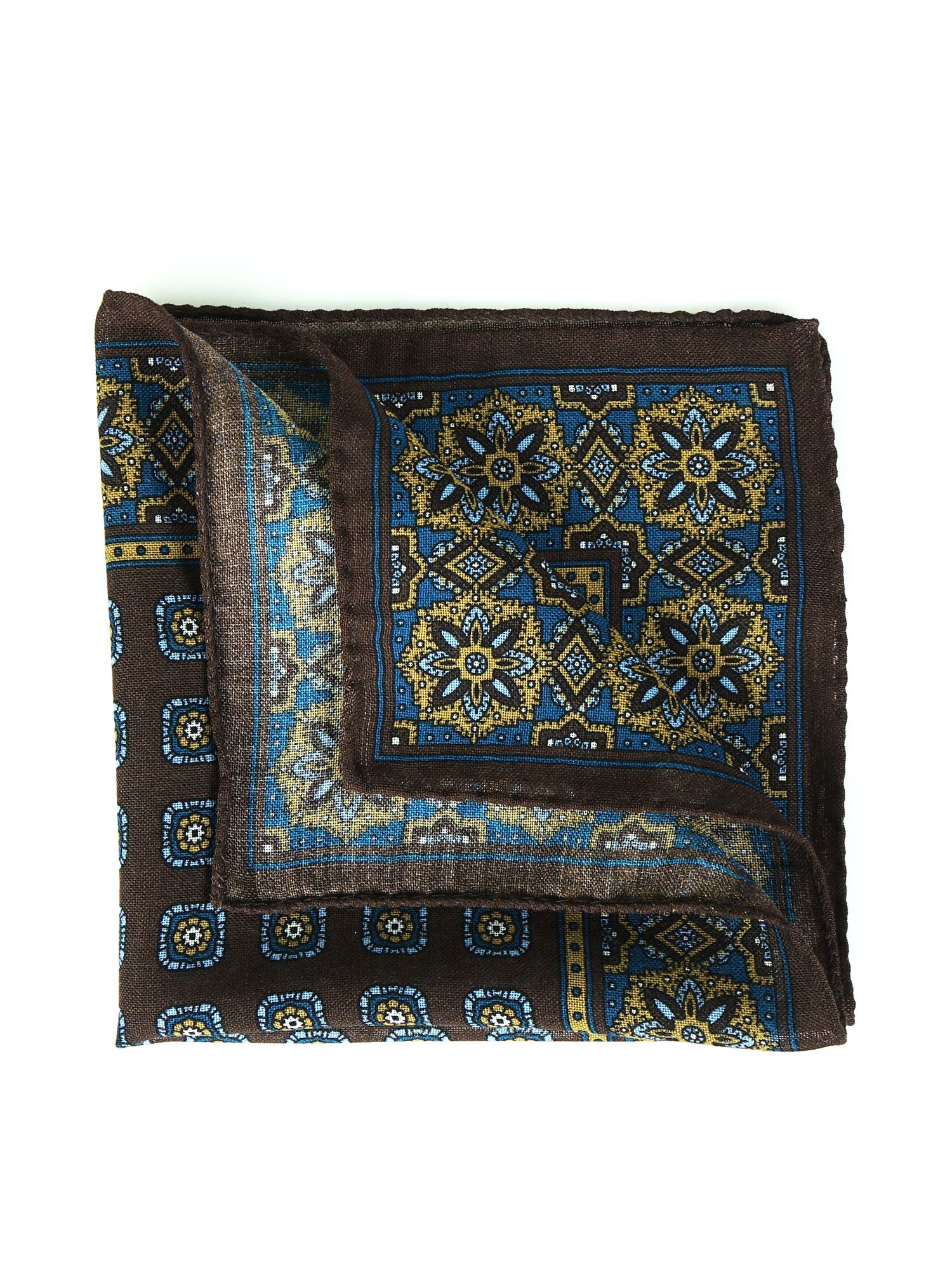 A true connoisseur's accessory, designed for the man who appreciates the texture and warmth of noble fabrics. This pocket square is made from a fine blend of wool and cashmere, giving it a soft, warm feel and a wonderfully matte appearance. The design is a masterpiece of balance: a dark brown background with a micro-geometric pattern is framed by a rich contrasting border, where the tones of turquoise and ochre anchor it perfectly to the cold season. Depending on how it is folded, it allows for the creation of always different chromatic effects.