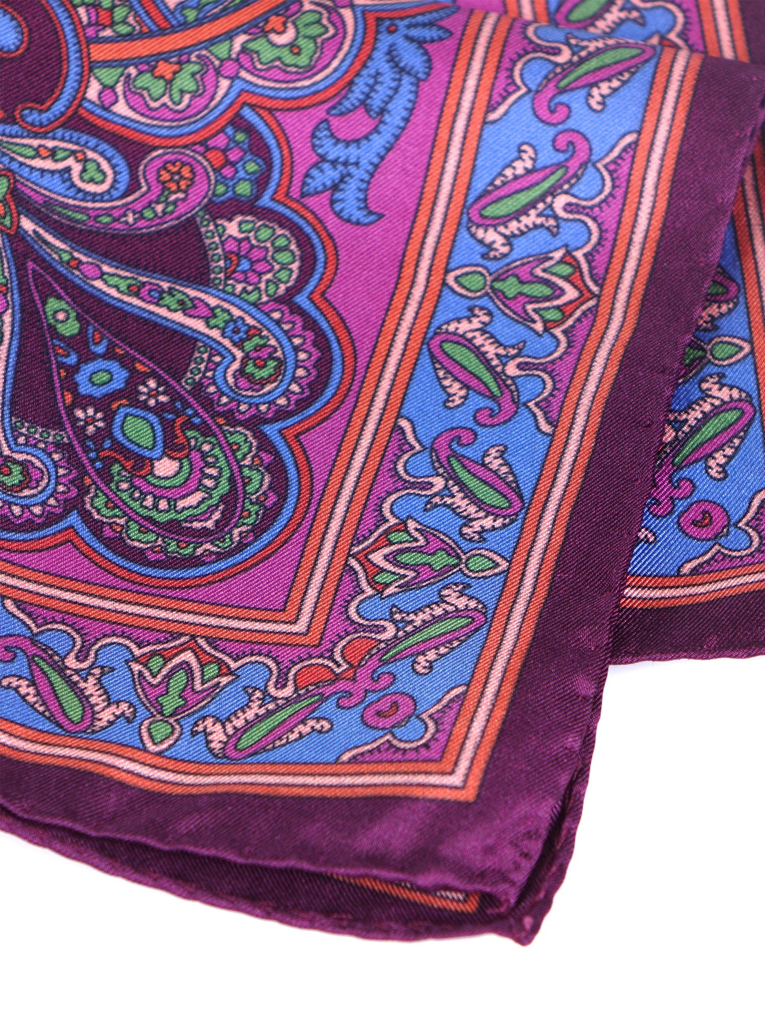 An accessory that is an explosion of color and art, designed for the man who dares to be bold with style and sophistication. This pocket square is made from the finest Italian printed silk, with vibrant shine and a soft, slippery hand. Its design is a sumptuous interpretation of the iconic Paisley pattern, in a bold color palette that combines jewel tones such as burgundy, turquoise, fuchsia, and red. It is the perfect piece for a man who uses accessories to define his style and express his personality.