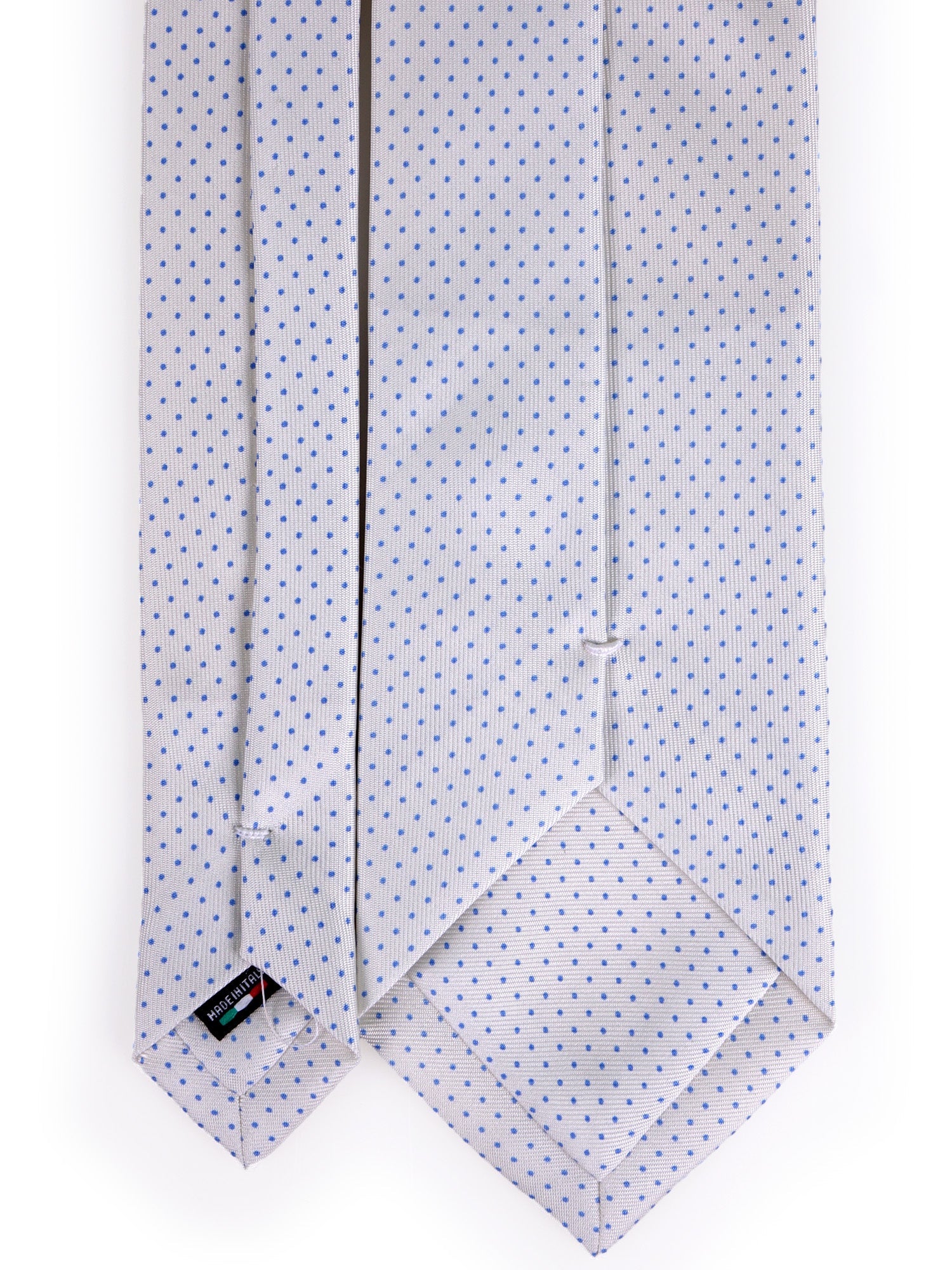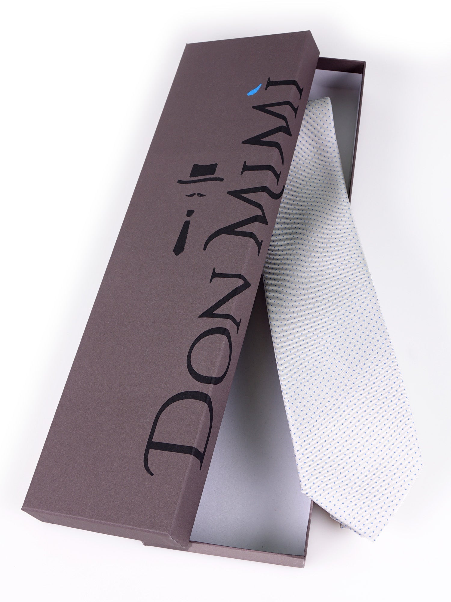 An accessory that is a declaration of status and purist refinement. The "Candore" tie by Don Mimì is crafted from exclusive printed English silk, renowned for its firm, dry, and matte hand, synonymous with discreet and never ostentatious luxury. The optical white background, rhythmically interrupted by a blue micro-pattern, illuminates the face conferring an aura of rigor and formal cleanliness. It is the choice of the man who is not afraid to stand out, preferring material excellence and an aesthetic of timeless charm.