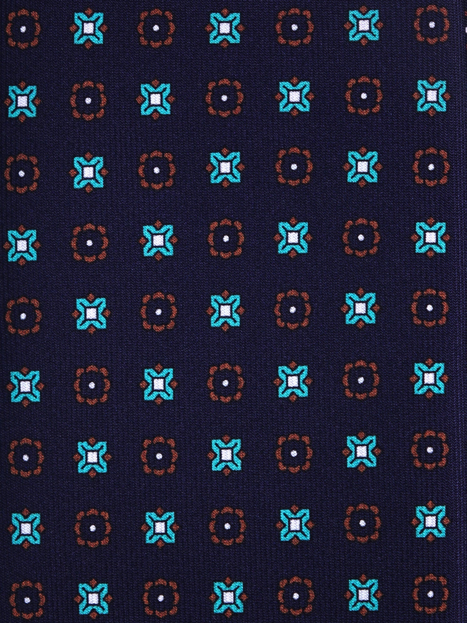 A masterpiece of tie-making art, the Seven Folds represents the pinnacle of luxury and tailor-made tradition, a jewel of the Don Mimì collection. Made from a single, generous panel of fine English printed silk, it is folded seven times without the aid of internal linings. This complex procedure creates a tie with unmatched weight and texture, capable of producing a rich, sumptuous knot and a simply perfect "dimple" (the indent under the knot). The design, a refined micro-pattern on a navy blue background, combines the warmth of rust brown with the unexpected touch of turquoise, creating an accessory for the man who appreciates the details that make a difference.