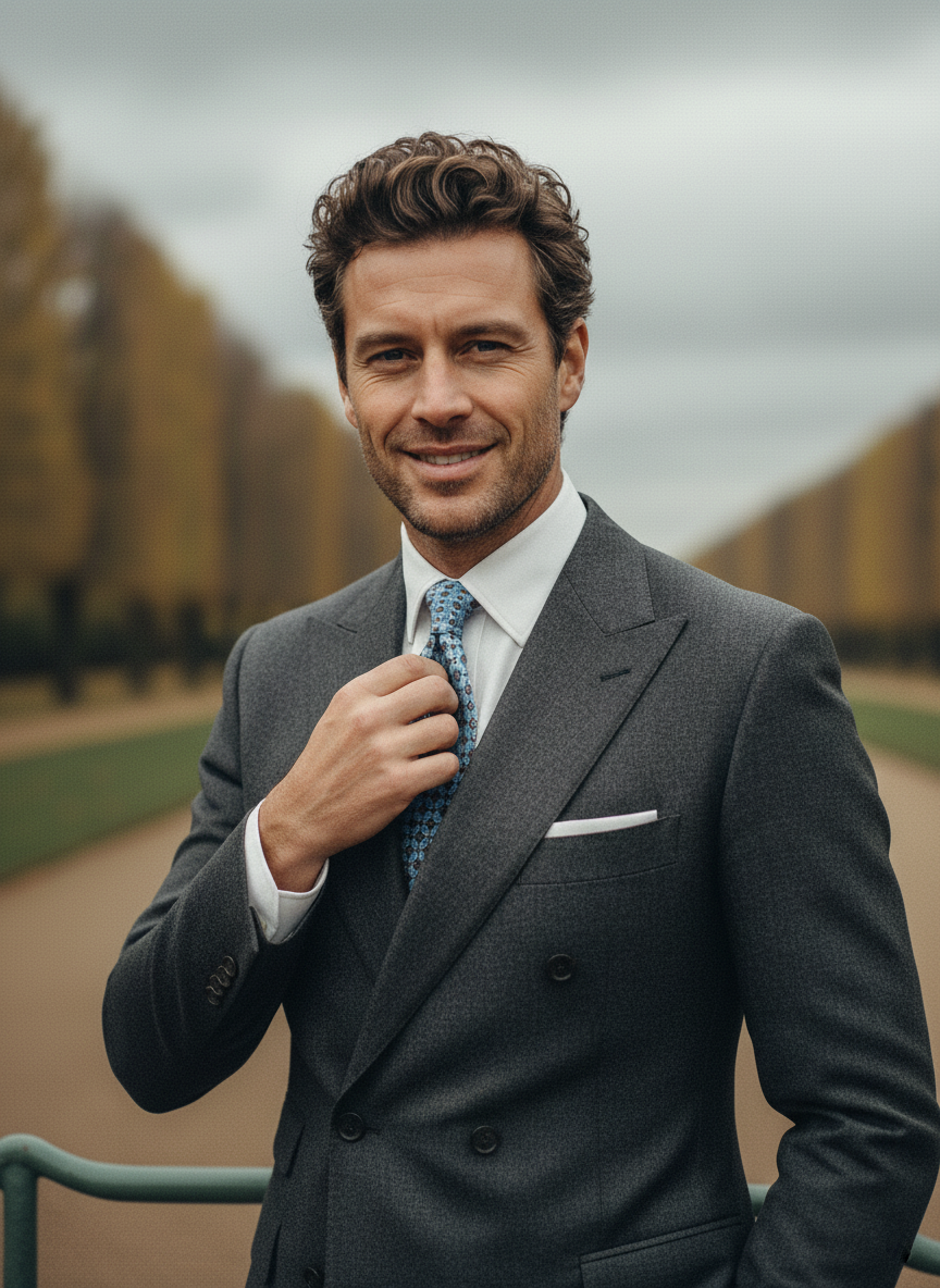 For the man who loves the art of matching. The blue base pairs beautifully with a brown sports jacket, in tweed or corduroy. The trousers can be in grey flannel. The pocket square can be a challis wool with a paisley pattern in green and burgundy tones, creating a sophisticated color dialogue. Brown leather suspenders are the detail that defines the connoisseur.
