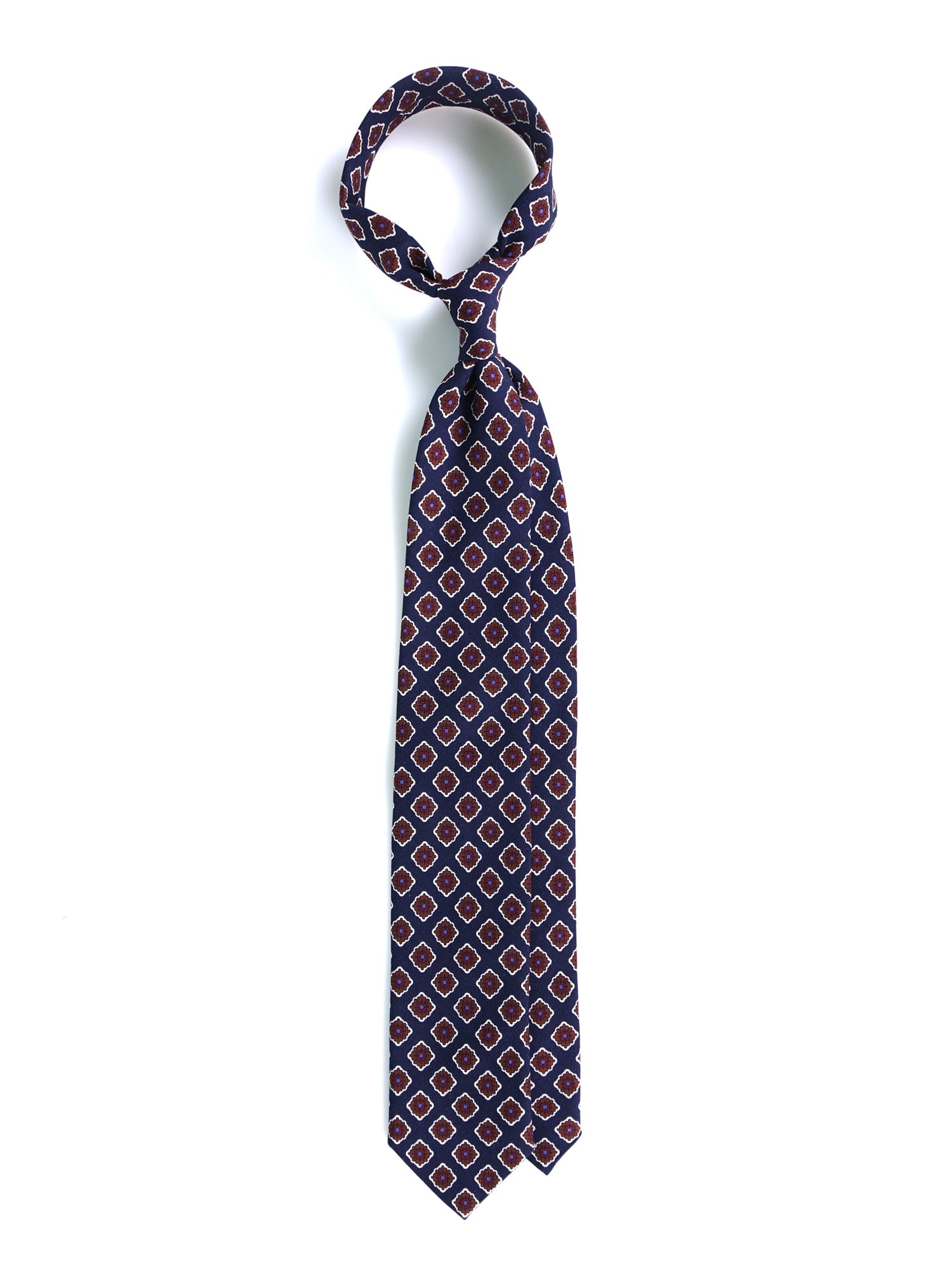 The quintessence of "British Style" interpreted by the Italian elegance of Don Mimì. This 3 fold tie is crafted from legendary English Challis wool, a fabric that combines feather lightness with the enveloping warmth of wool, characterized by an unmistakable velvety and matte feel. The deep, authoritative dark blue background is embellished with geometric medallions in warm brown and burgundy tones, creating a perfect color balance for the autumn-winter season.