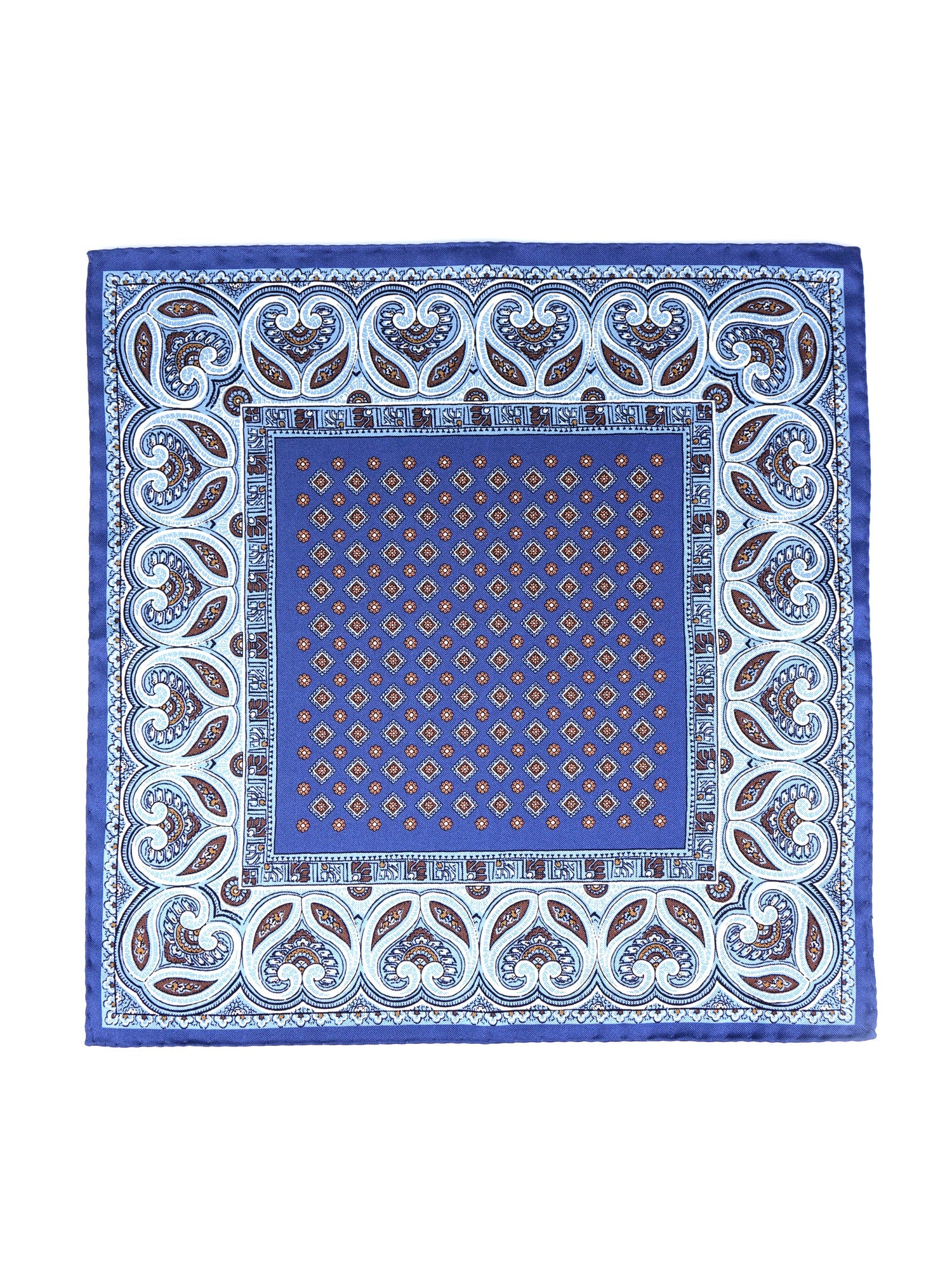 An accessory that is truly a 'four handkerchiefs in one', designed for the man who loves versatility and elegance. This pocket square is made from pure Italian printed silk, with a vibrant luster and a soft touch. Its unique design combines two souls: a center with a micro-geometric pattern on a blue background, and a sumptuous border with a classic cashmere (paisley) pattern in shades of blue, white, and brown. This construction allows, depending on the fold, to create completely different looks with a single accessory.