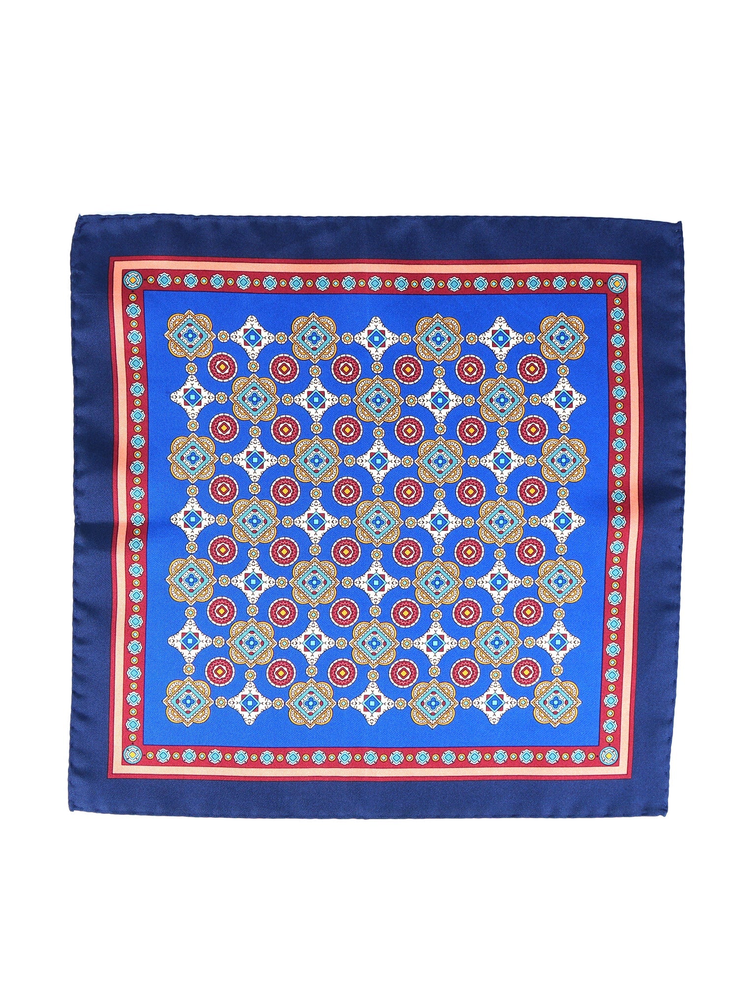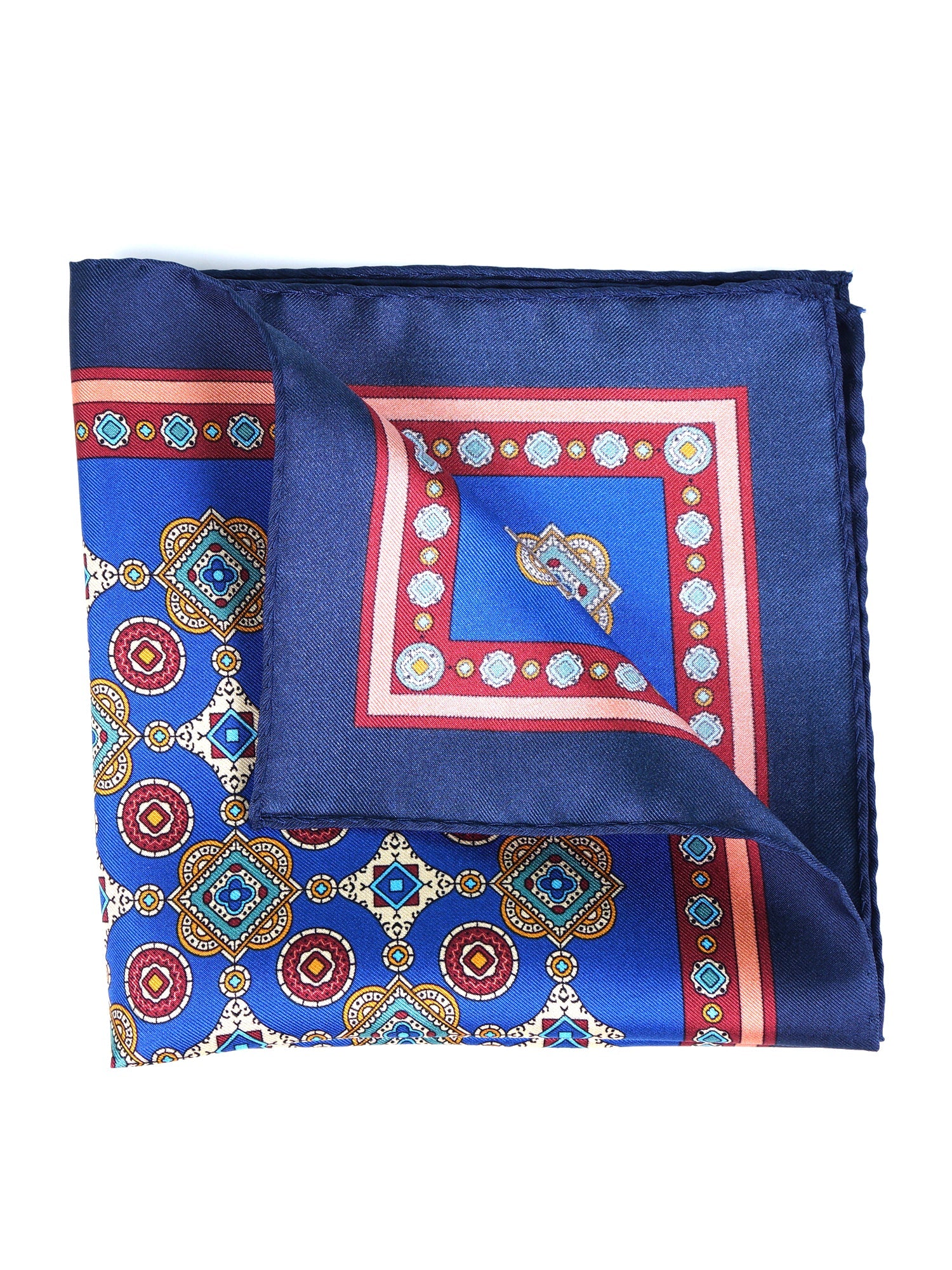 An accessory that is a true "four handkerchiefs in one", designed for the man who loves versatility and elegance. This pocket square is made of pure Italian printed silk, with vibrant luster and a soft hand. Its unique design combines two souls: a center with a majolica pattern on a royal blue background, and a more formal and discreet border with a geometric pattern on a navy blue background. This construction allows, depending on the fold, to create completely different looks with a single accessory.
