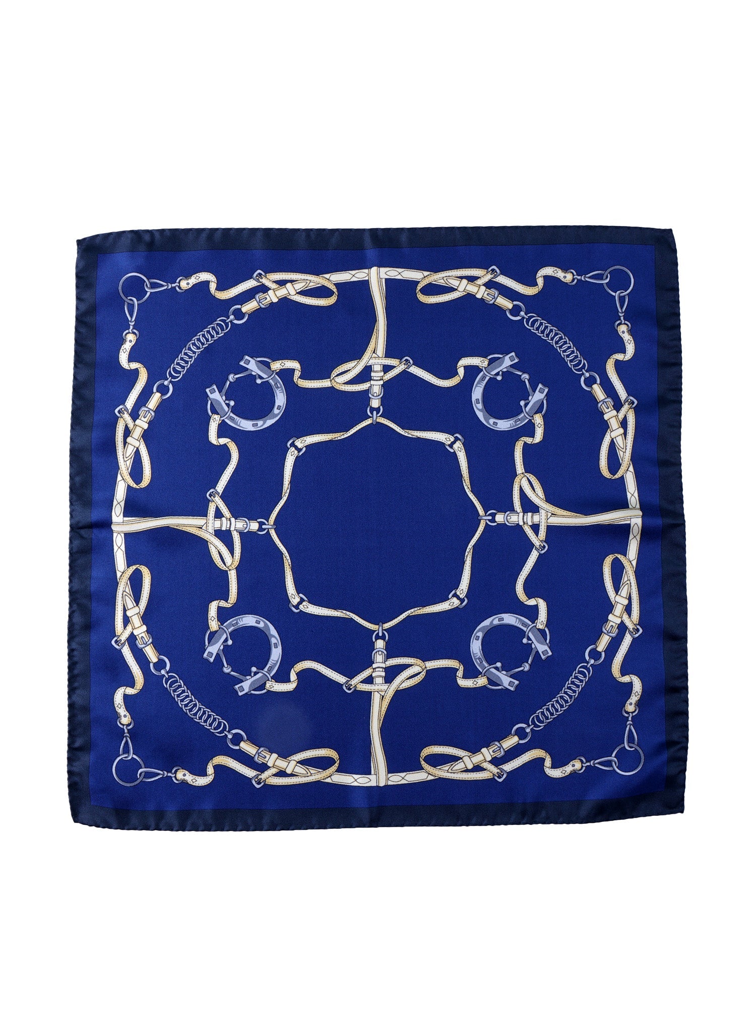 An accessory that is a true statement of elegance. This Don Mimì pocket square, with its generous dimensions of 45x45 cm, is made of pure Italian printed silk, a fabric that ensures a luxurious feel and the ability to create rich and theatrical folds. The print, a tribute to the art of saddlery, intertwines tack and bits on a vibrant royal blue background, framed by a deep navy blue border. It’s the detail for the man who leaves nothing to chance and chooses accessories that tell a story of tradition and style.