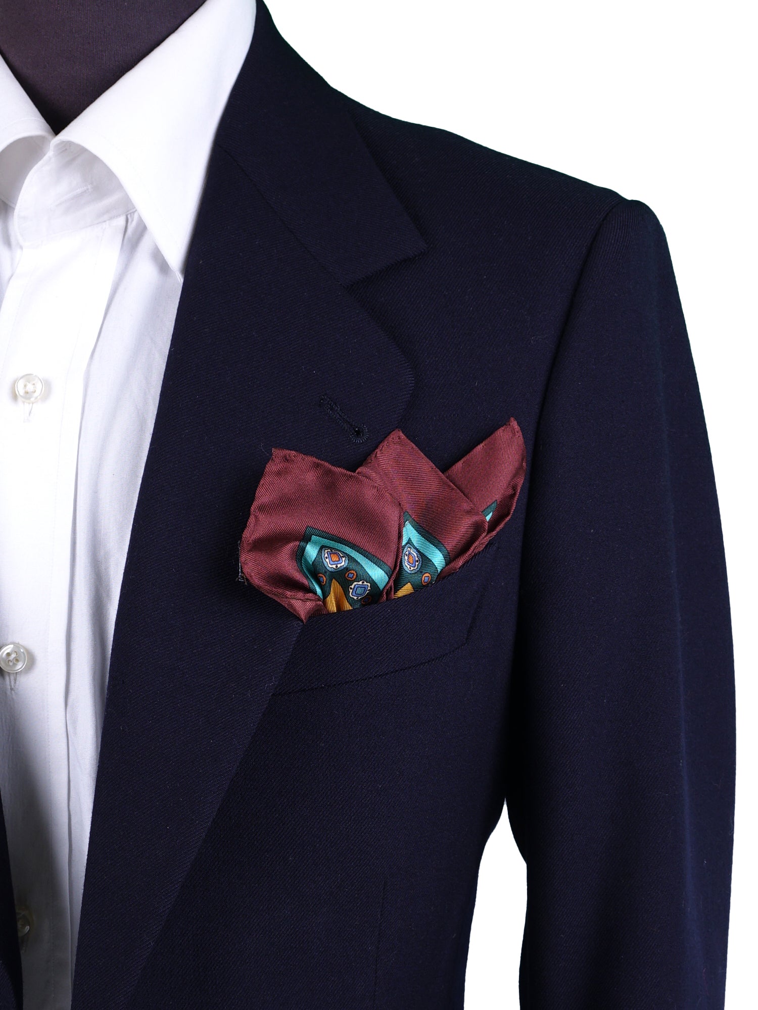 An accessory that is truly a "four handkerchiefs in one", designed for the man who loves versatility and elegance. This pocket square is made from the purest printed Italian silk, with vibrant luster and a soft touch. Its unique design combines two souls: a center with a majolica pattern on a gold background, and a more formal and discreet border with a geometric pattern on a burgundy background. This construction allows, depending on the fold, to create completely different looks with a single accessory.