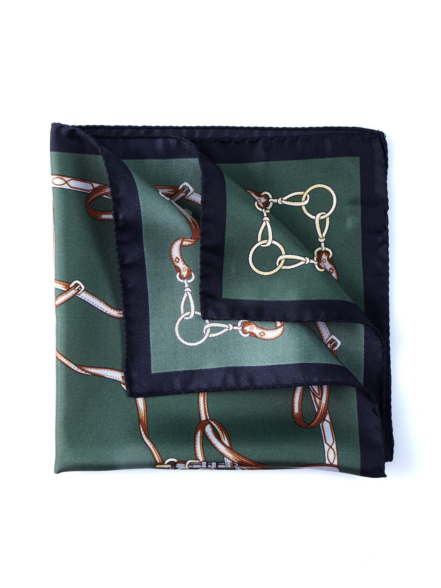 An accessory that is a true statement of elegance. This pocket square, in its generous dimensions of 45x45 cm, is made of pure Italian printed silk, a fabric that ensures a luxurious feel and the ability to create rich and dramatic folds. The print, a tribute to the art of saddlery, intertwines tack and bits on a deep forest green background, with gold and leather details creating a sophisticated chromatic contrast. It is the detail for the man who leaves nothing to chance and chooses accessories that tell a story of tradition and style.