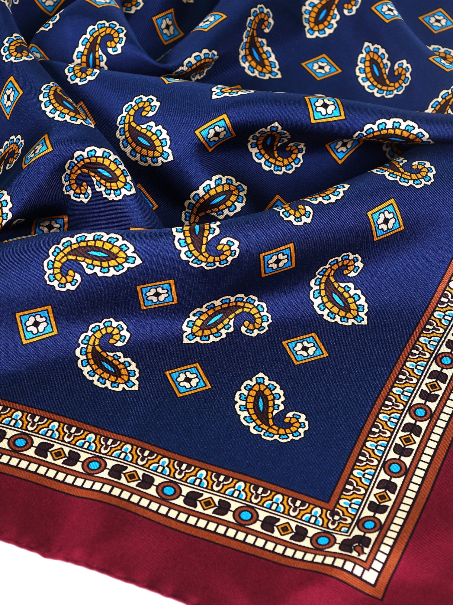 An accessory that is a pure statement of style, for the man who appreciates timeless classics. This pocket square is made of pure Italian printed silk, a fabric with a rich sheen and soft, slippery hand feel. Its design is a masterpiece of balance: a vibrant blue field is enriched with the iconic paisley pattern, rich in ochre and turquoise details. All is framed by a rich bordeaux border, making this piece unique and of great personality.