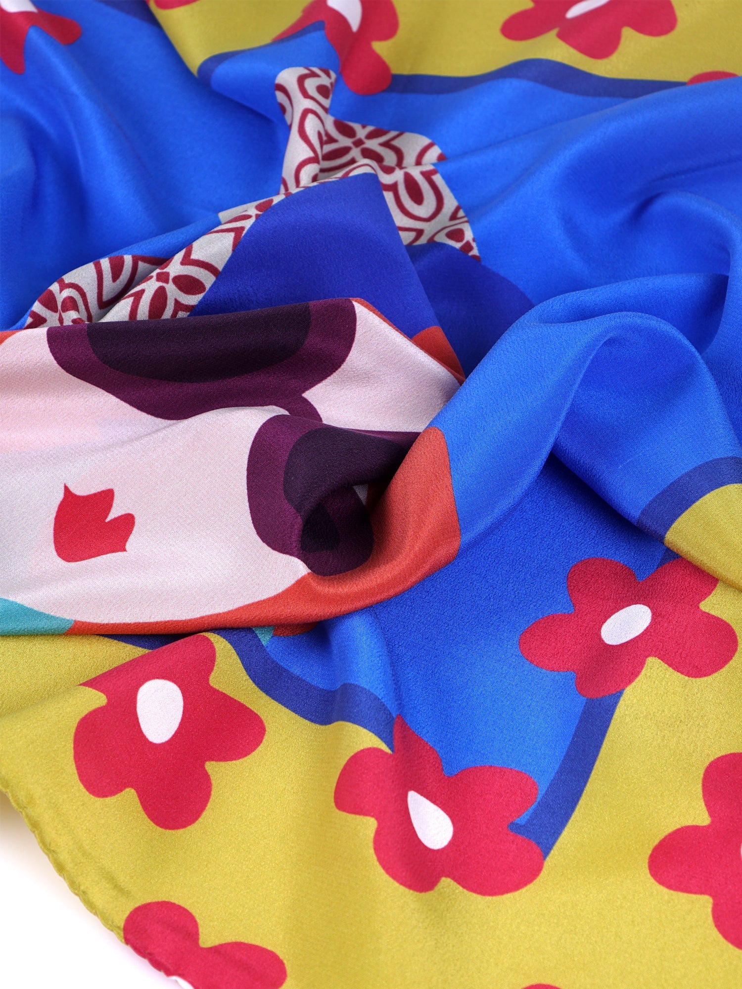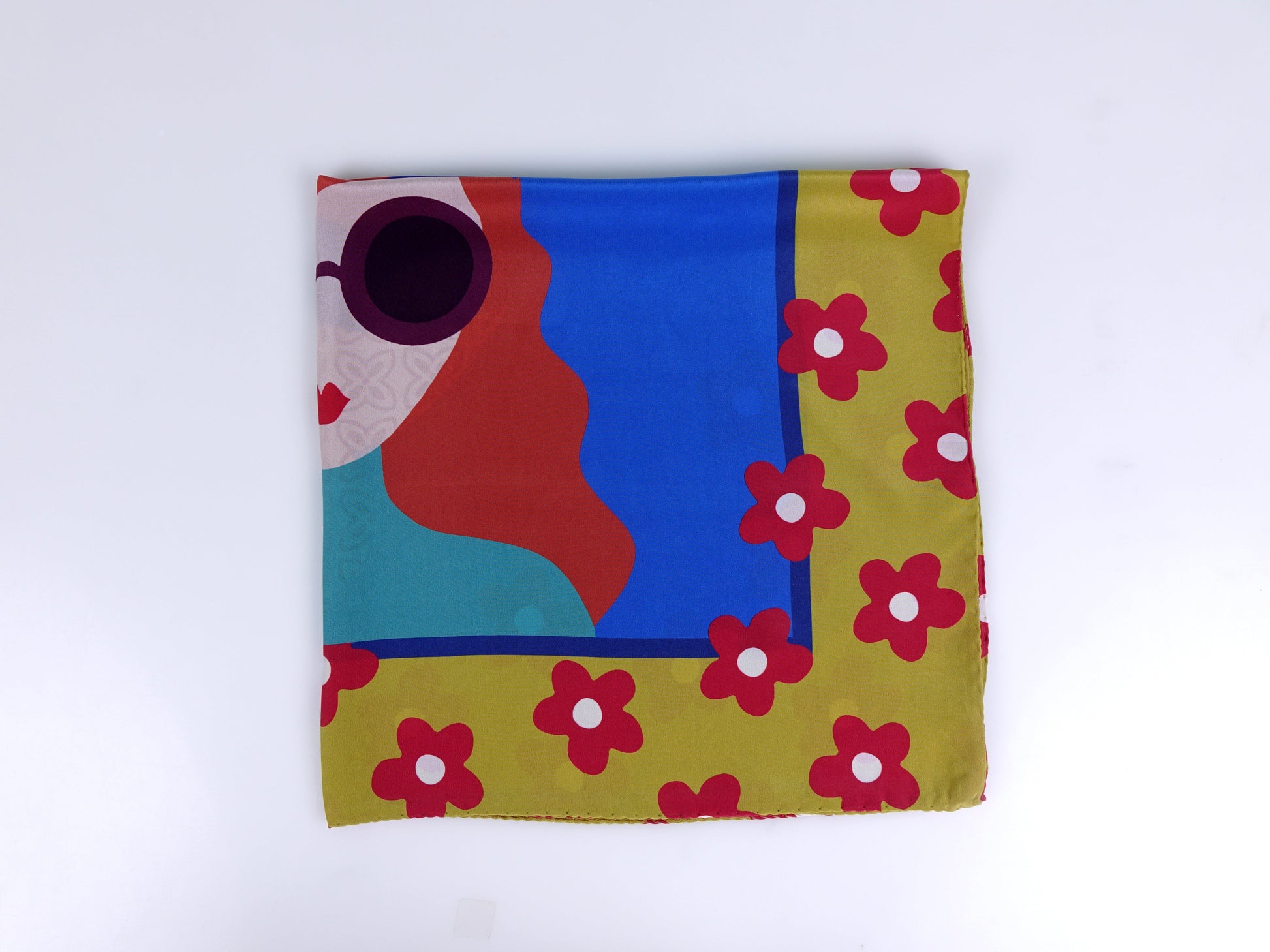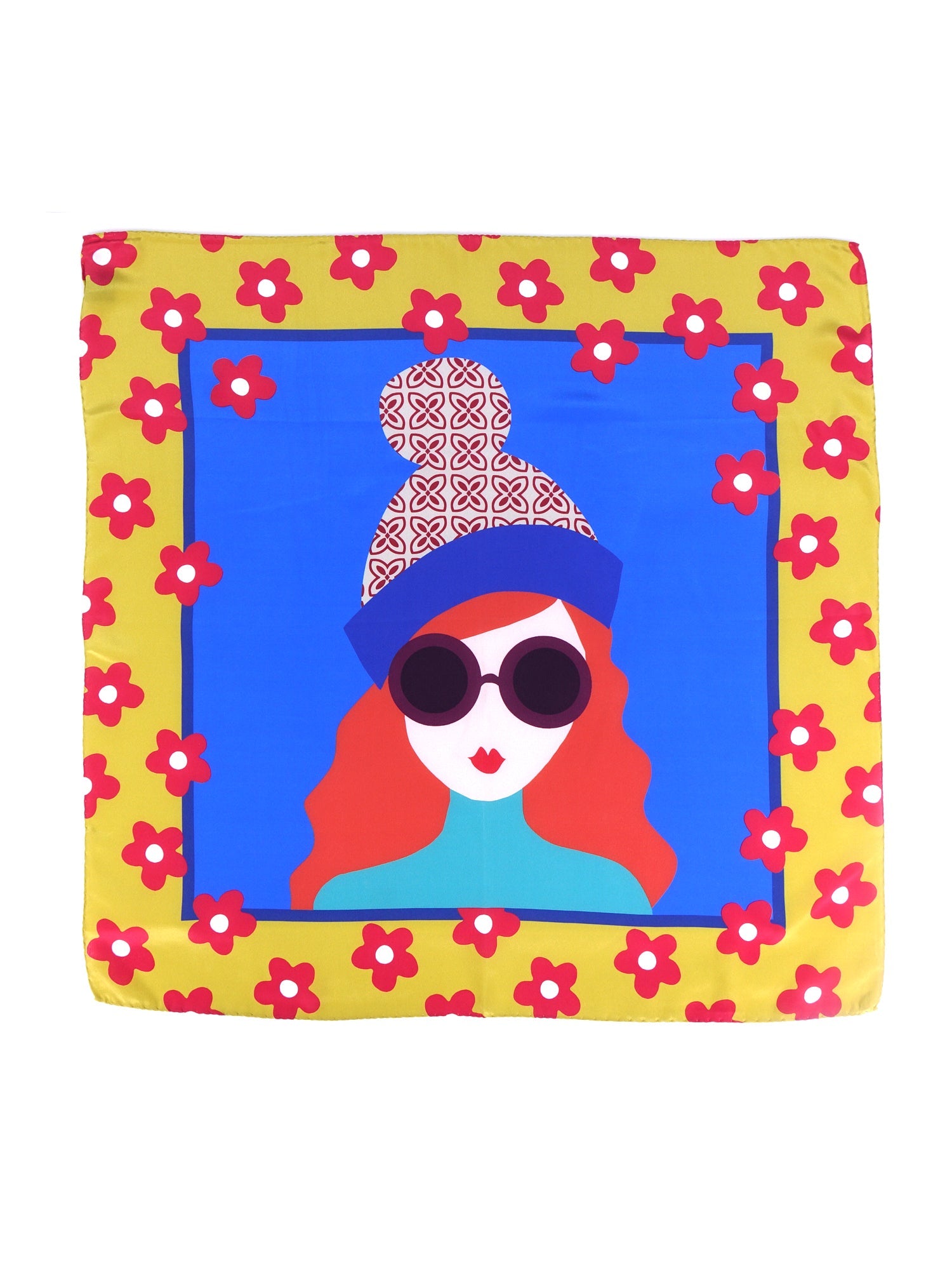 An accessory that is a true work of art to wear, a design piece that catches the eye with its chromatic boldness and pop spirit. This scarf is made of pure Italian silk, a fabric with a soft hand and vibrant shine. At the center, a stylized portrait of a mysterious and chic woman, with large sunglasses and a fashionable hat. The scene is framed by a floral motif inspired by the '70s, in a contrasting color palette of yellow, blue, and red. It's the perfect scarf for the woman who isn't afraid to be the main character and loves accessories that tell a story.