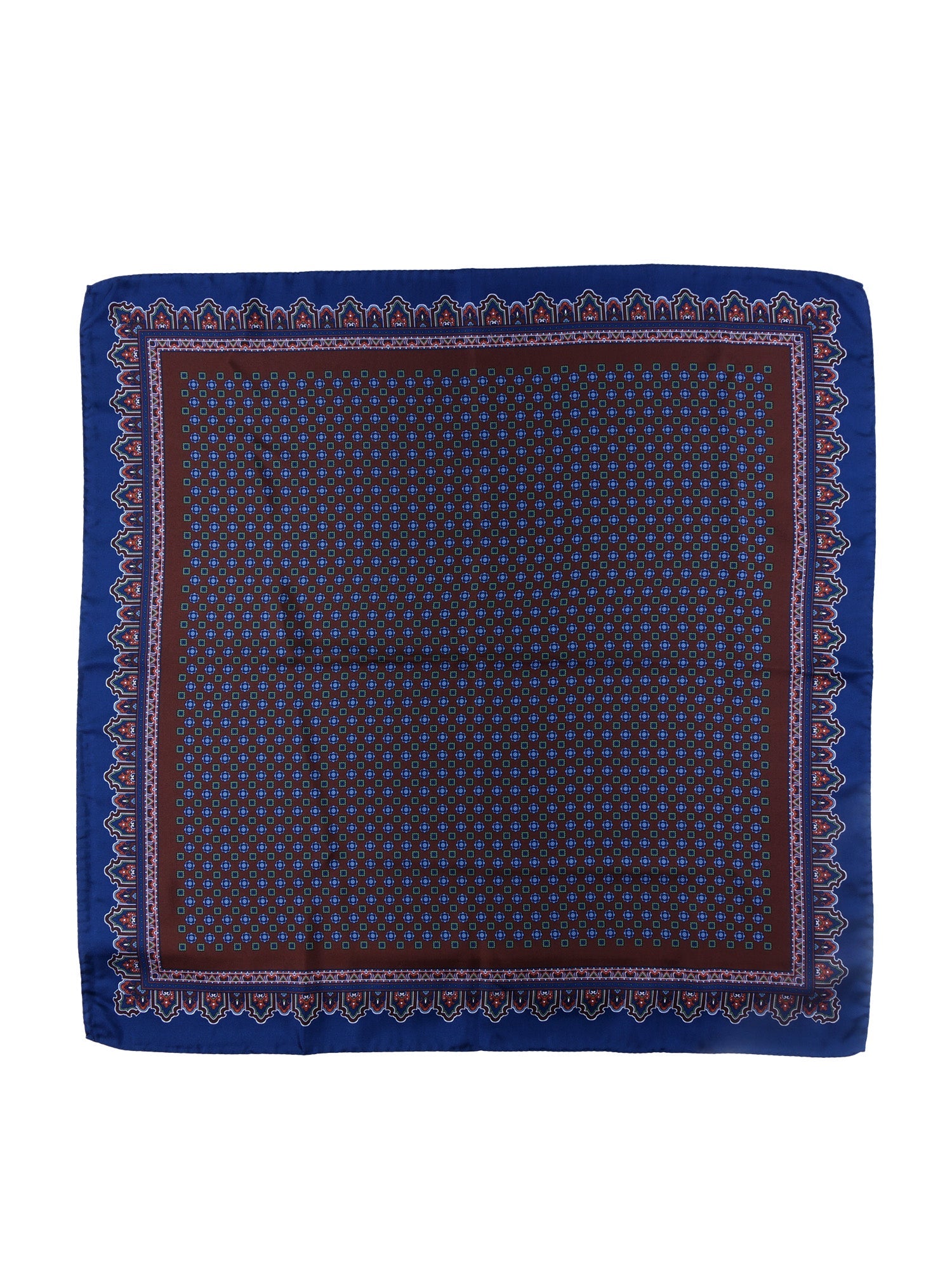 An accessory that marks the transition from ordinary elegance to the style of a true connoisseur. This men's scarf is made of pure Italian printed silk, a fabric with impeccable drape and luxurious hand. Its design is a masterpiece of balance: a refined central micro-geometric pattern is framed by a rich contrasting border, playing on the warm tones of ochre and the freshness of light blue. Its generous size makes it perfect for wearing around the neck, replacing the tie with a unique touch of class and personality.