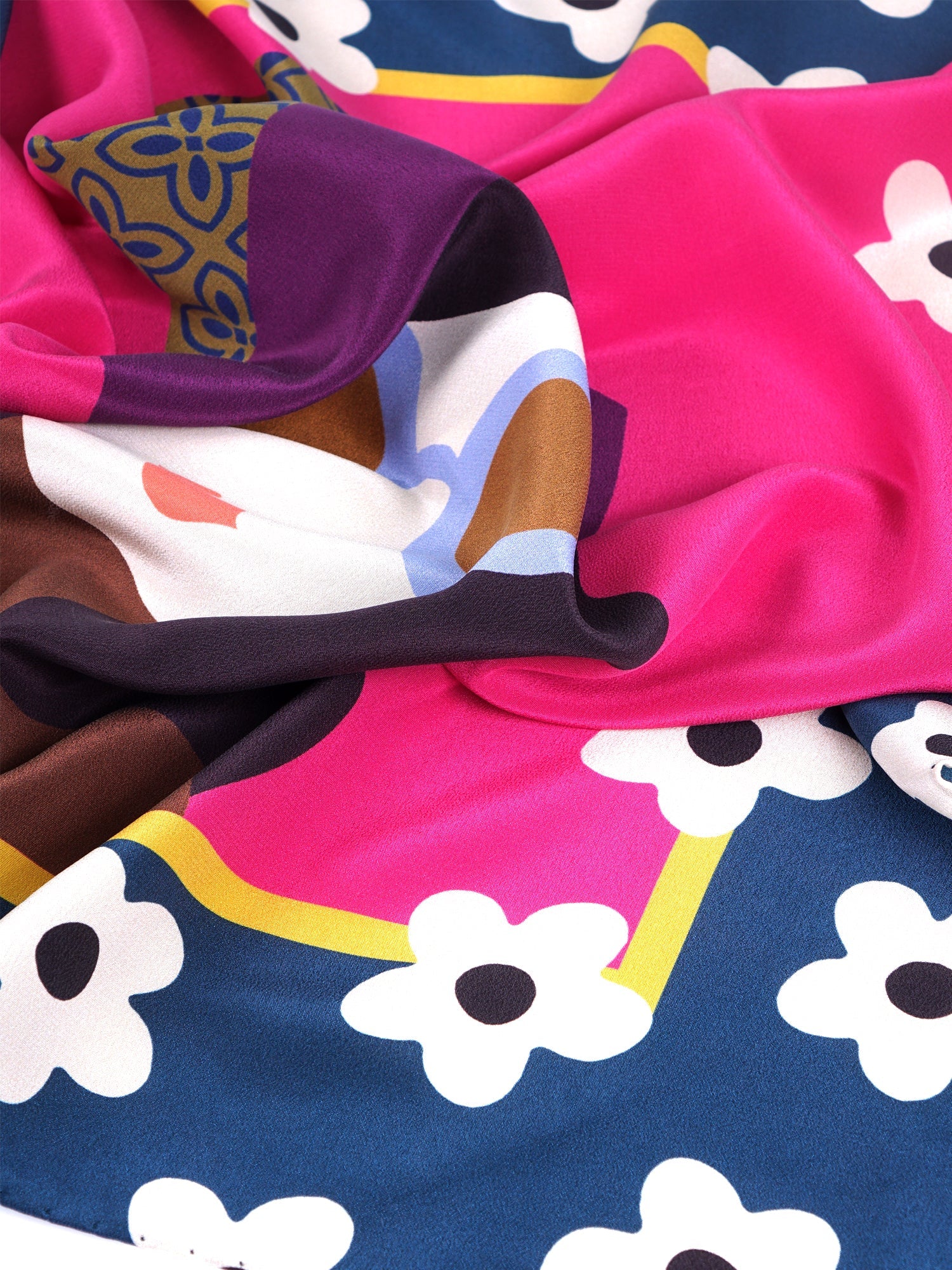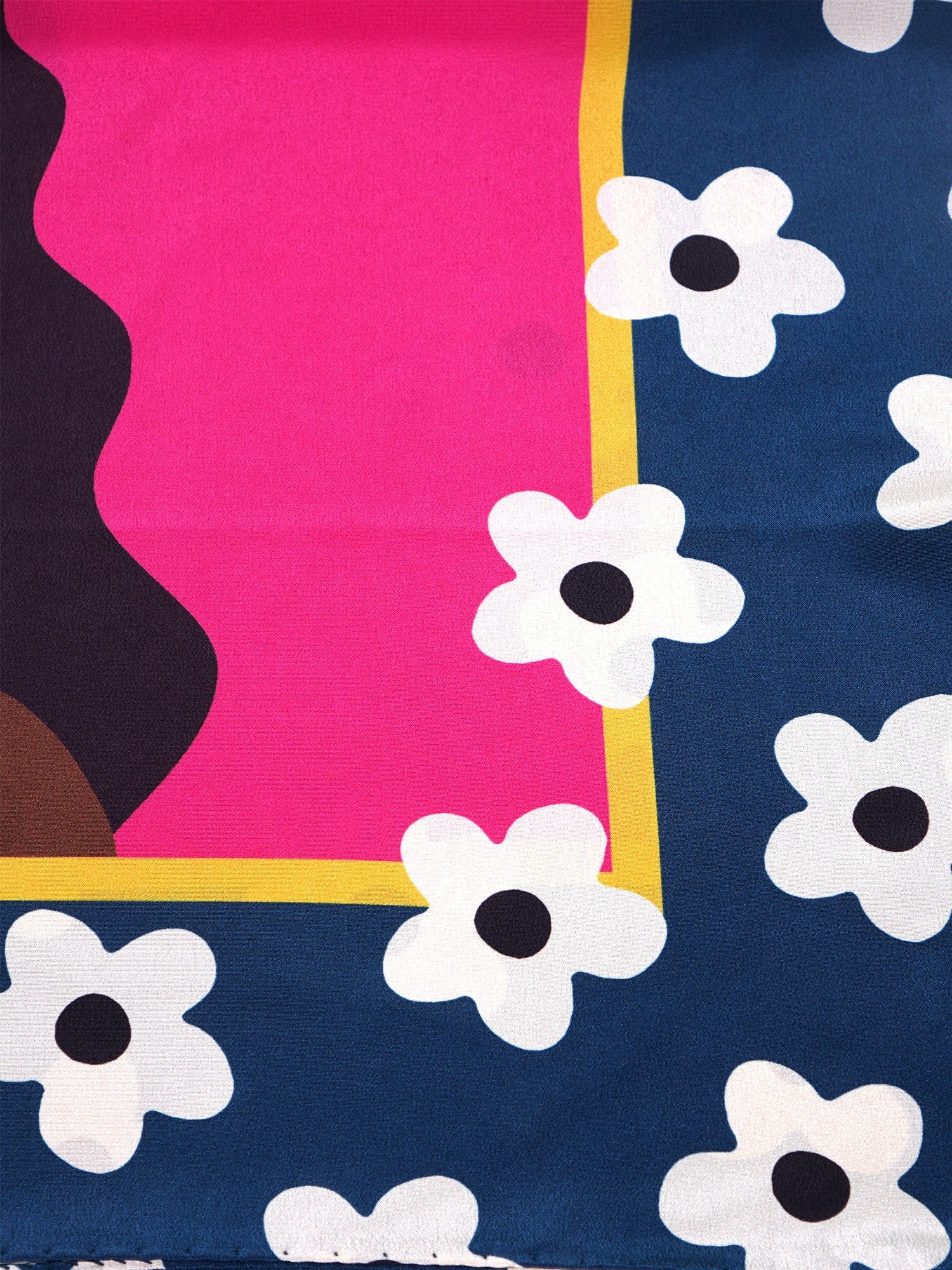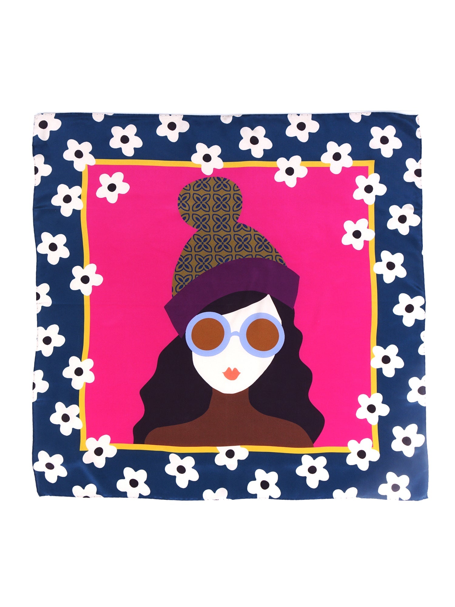 An accessory that is a true work of art to wear, a design piece that captures the eye with its bold colors and pop spirit. This scarf is made of fine crinkled silk, a fabric with a slightly granular feel and a matte appearance that enhances the depth of colors. At the center, the stylized portrait of a mysterious and chic woman, with oversized sunglasses and a fashionable hat, set against a vibrant fuchsia background. The scene is framed by a floral pattern inspired by the '60s, in a graphic palette of blue, white, and yellow. It is the perfect scarf for the woman who is not afraid to be the protagonist and loves accessories that tell a story.