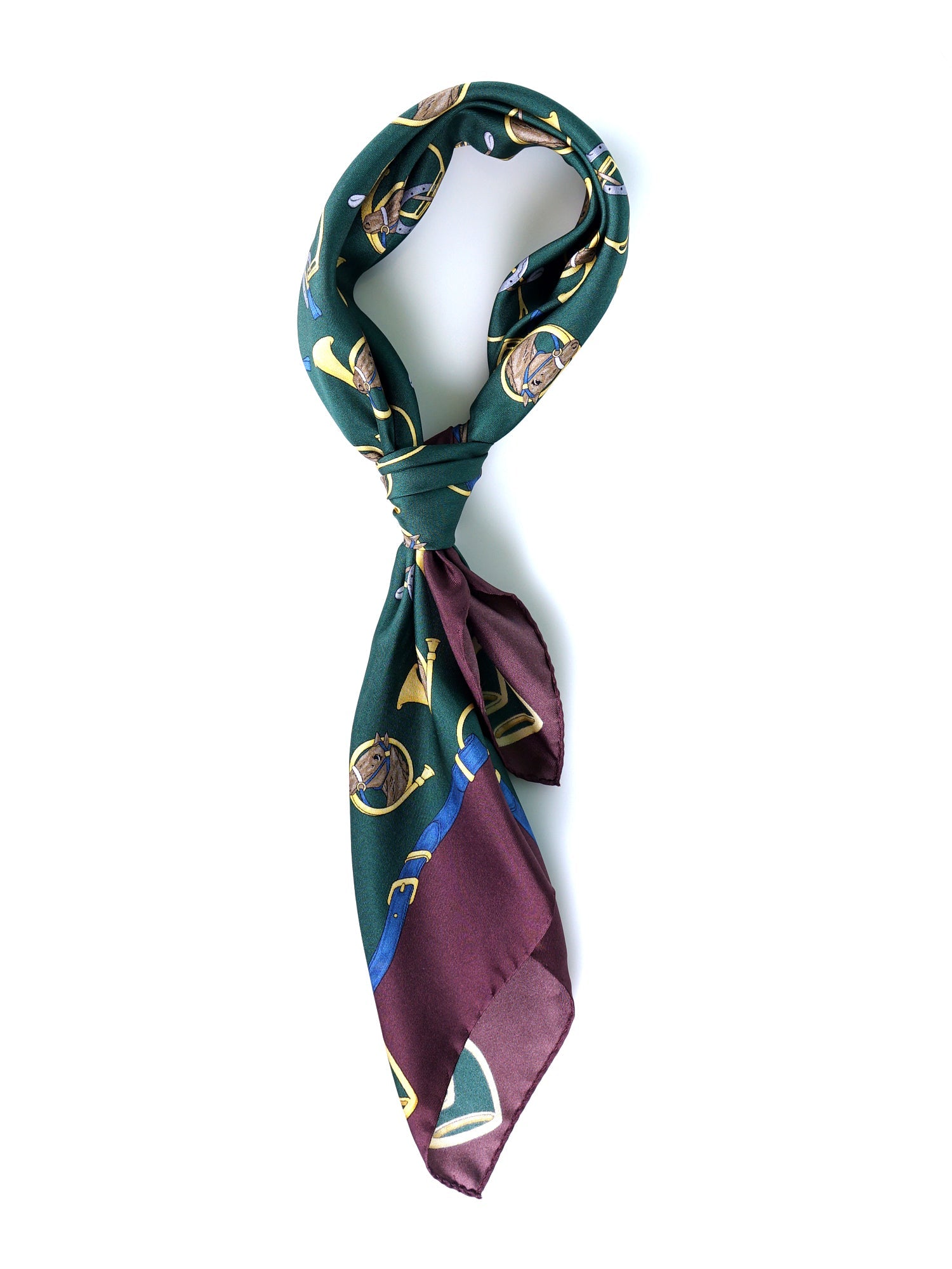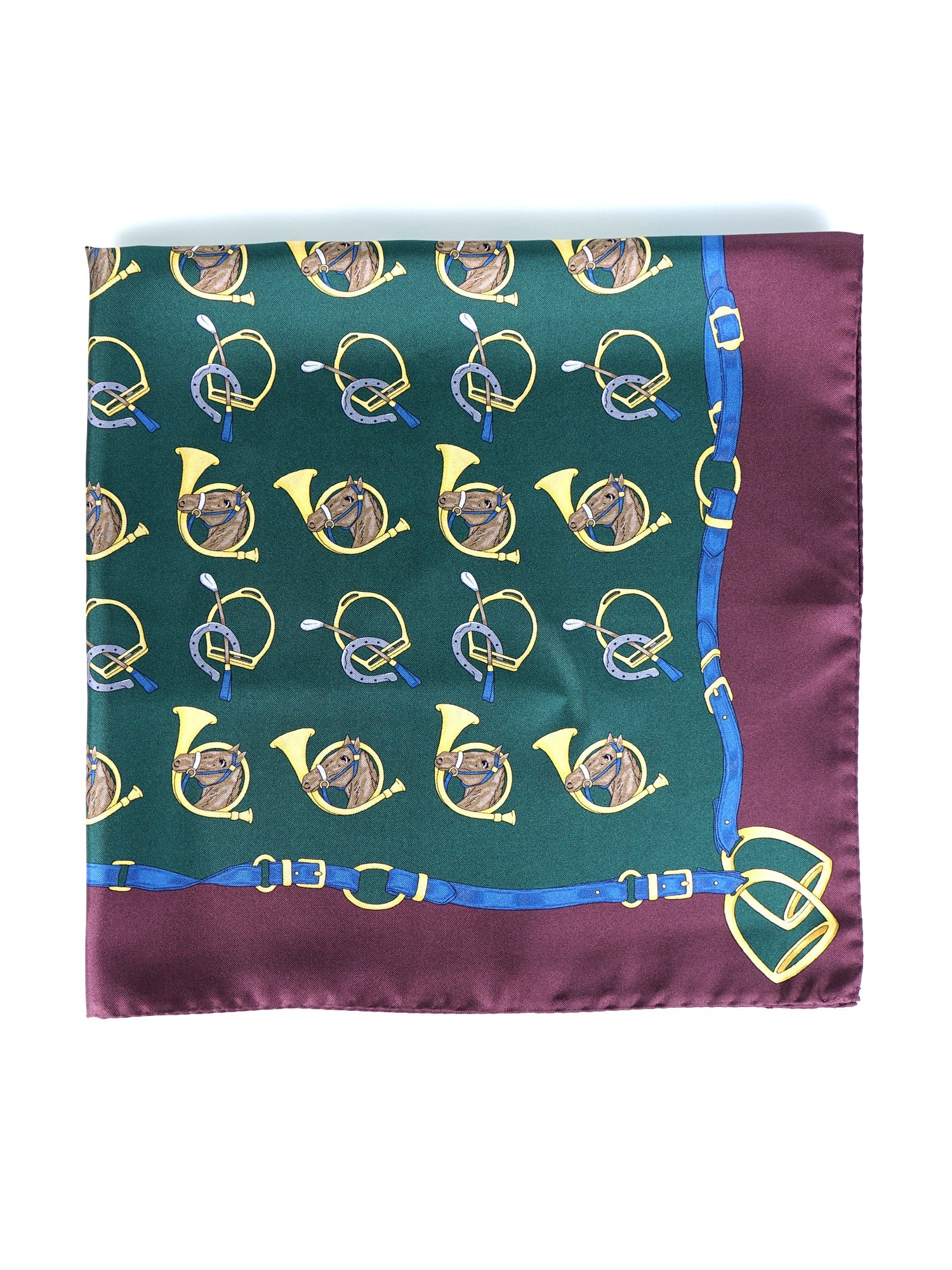 An accessory that tells a story, a collector's piece that evokes aristocratic elegance and the tradition of horseback hunting. This scarf is made from pure Italian silk, a fabric with an impeccable drape and luxurious feel. Its design is a masterpiece of balance: a deep forest green field is enriched with a repeated motif of hunting horns, horse heads, and stirrups, all framed by a rich burgundy border. It is an iconic piece, perfect for the man who loves a style that speaks of culture, a passion for the outdoors, and unconventional elegance.