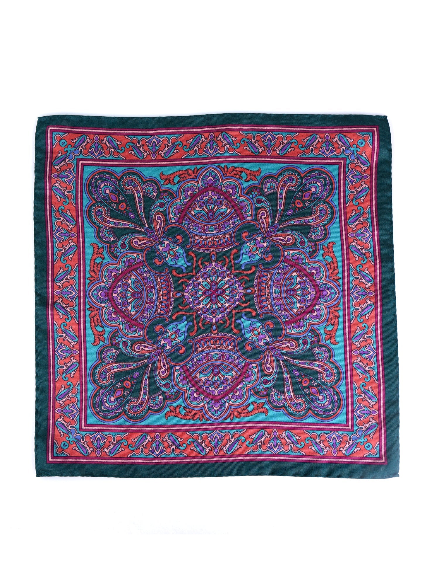 An accessory that is an explosion of color and art, designed for the man who dares to be stylish and refined. This pocket square is made of pure Italian printed silk, featuring a vibrant sheen and a soft, silky hand. Its design is a sumptuous interpretation of the iconic Paisley pattern, in a bold color palette that unites jewel tones like emerald green, turquoise, orange, and fuchsia/purple. It is the perfect piece for the man who uses accessories to define his style and communicate his personality.