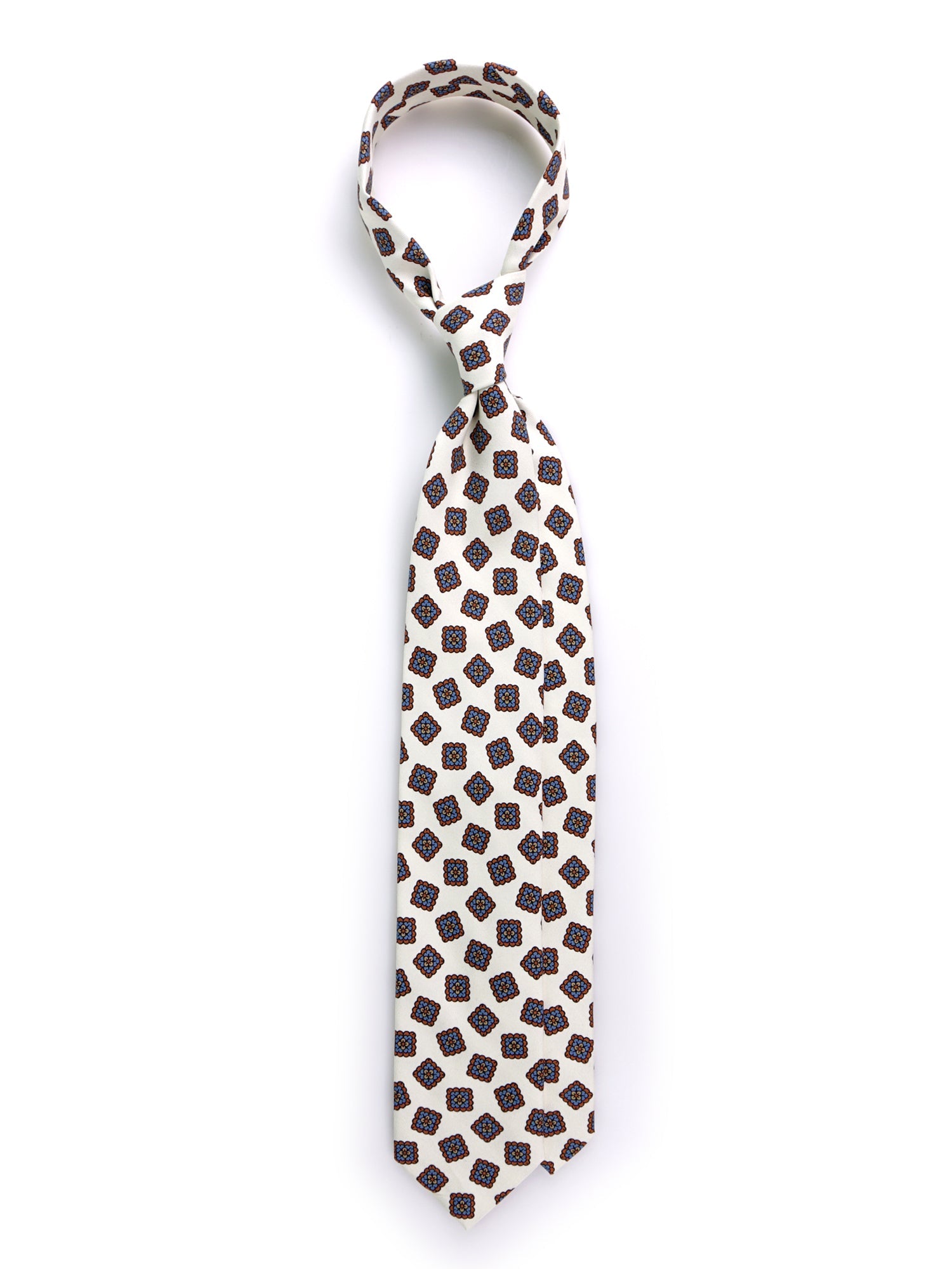 Expression of a quiet and cultured luxury, this Don Mimì tie is made of the legendary "Ancient Madder" silk. Characterized by its unmistakable "chalky hand" and a matte, velvety finish, it represents the pinnacle of sartorial refinement. The white background, rare and distinctive for a madder silk, illuminates the rigor of the geometric pattern in classic tones of brown and blue. An accessory destined for the man who does not follow trends but guards the tradition of timeless elegance.