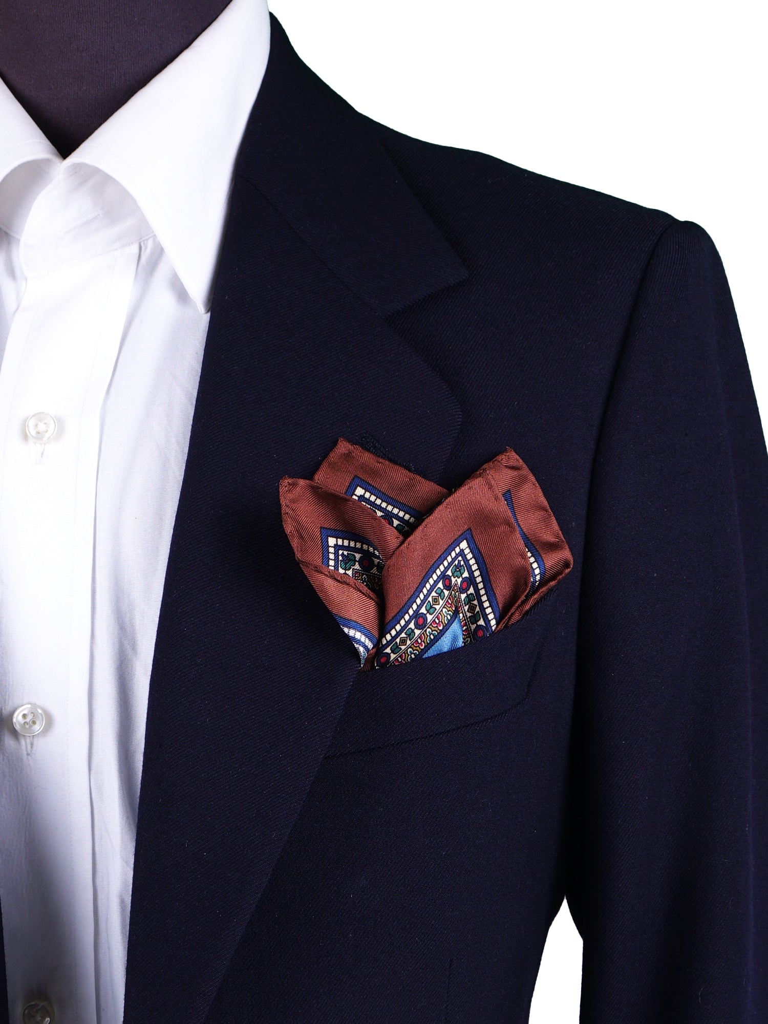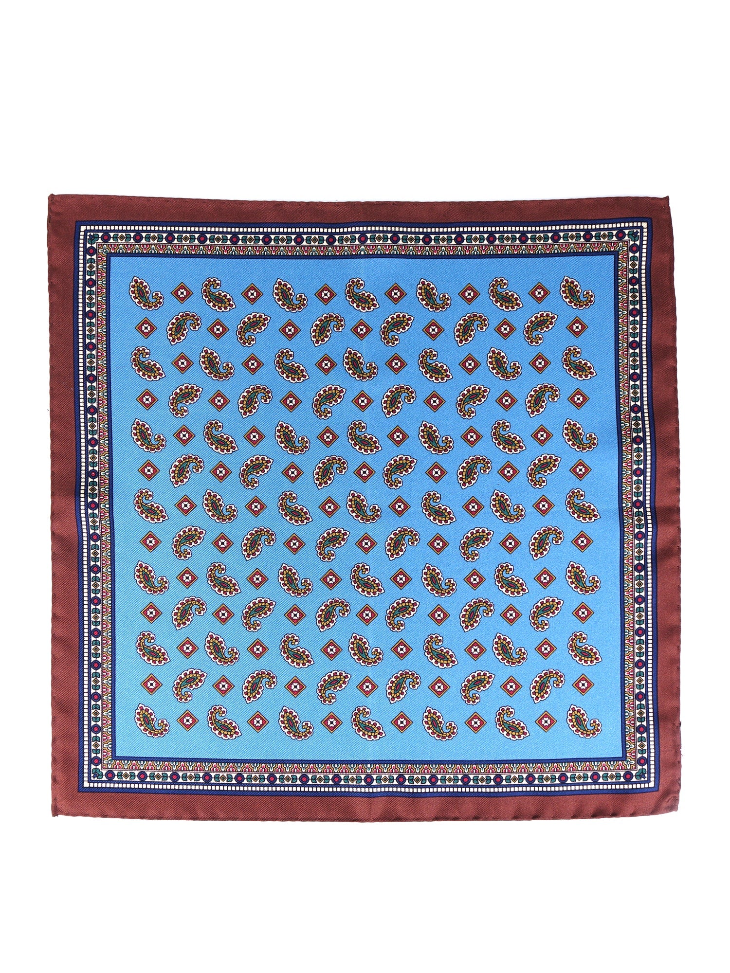 An accessory that is a pure statement of style, for the man who appreciates timeless classics. This pocket square is made of the finest printed Italian silk, a fabric with rich luster and a soft, slippery hand. Its design is a masterpiece of balance: a vibrant light blue field is enriched by the iconic paisley pattern, rich in red, yellow, and green details. The whole is framed by a rich brown border, making this piece unique and full of personality.