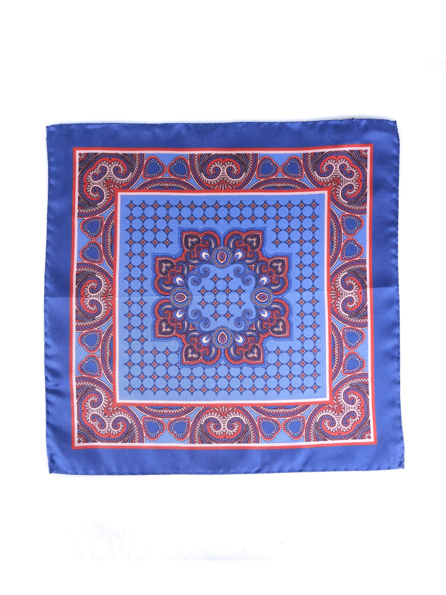 An accessory that is a miniature work of art, a design piece that captivates the eye with its complexity and bold colors. This pocket square is made from the finest Italian printed silk, featuring a rich sheen and a soft, smooth touch. Its design is a masterpiece of balance: a sumptuous central medallion, surrounded by a micro-geometric pattern, is framed by a rich paisley border. The color palette, which combines a vibrant blue, a warm coral red, and a sophisticated dove gray, makes it a unique piece with great personality.