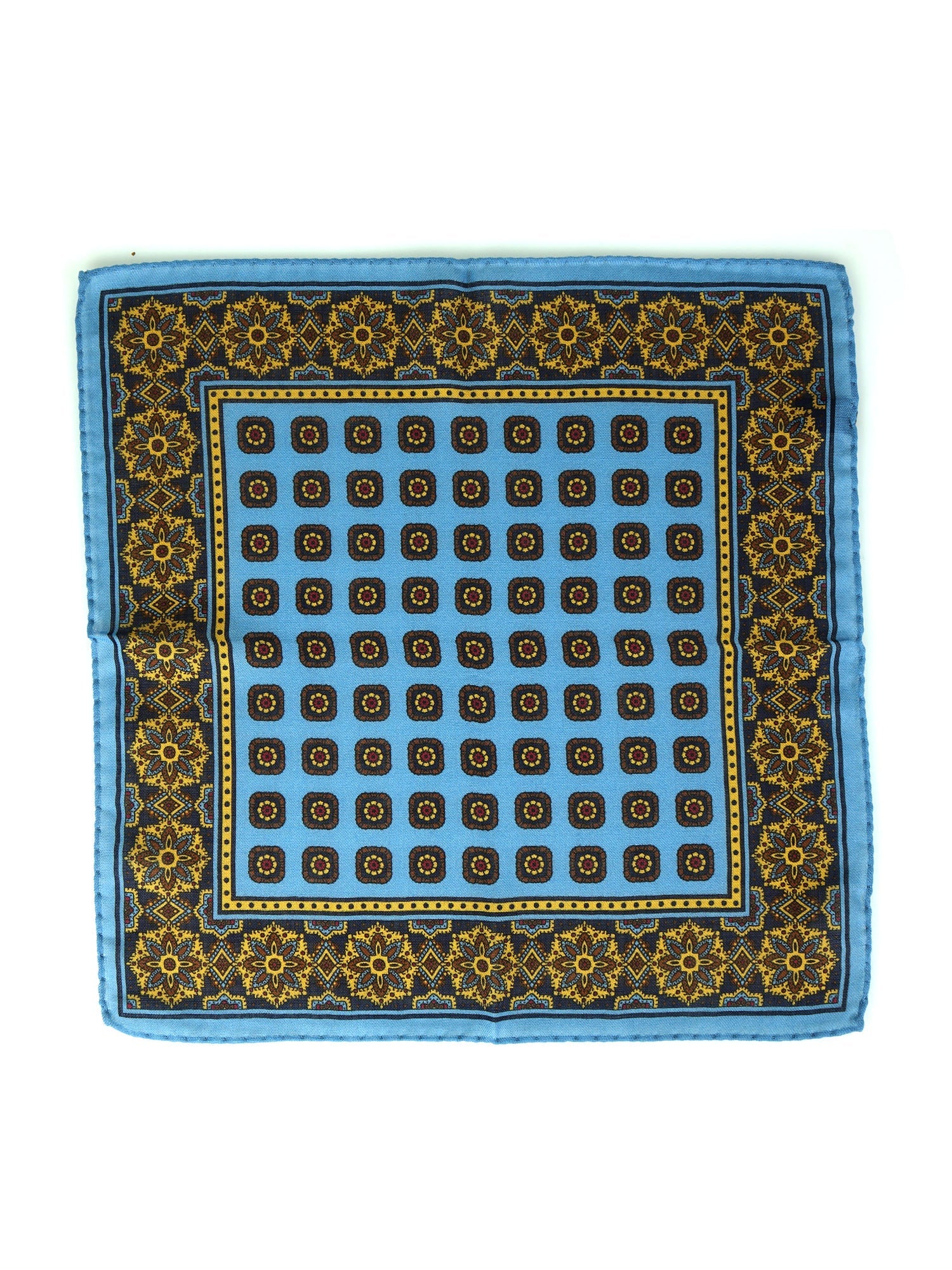 An accessory for true connoisseurs, designed for the man who appreciates the texture and warmth of fine fabrics. This pocket square Don Mimì is made from a premium blend of wool and cashmere, giving it a soft, warm hand and a wonderfully matte appearance. The design is a masterpiece of balance: a surprising light blue background with a micro-geometric pattern is framed by a rich contrasting border, where the warm tones of ochre and brown anchor it perfectly to the cold season. Depending on how it's folded, it allows for different color effects.
