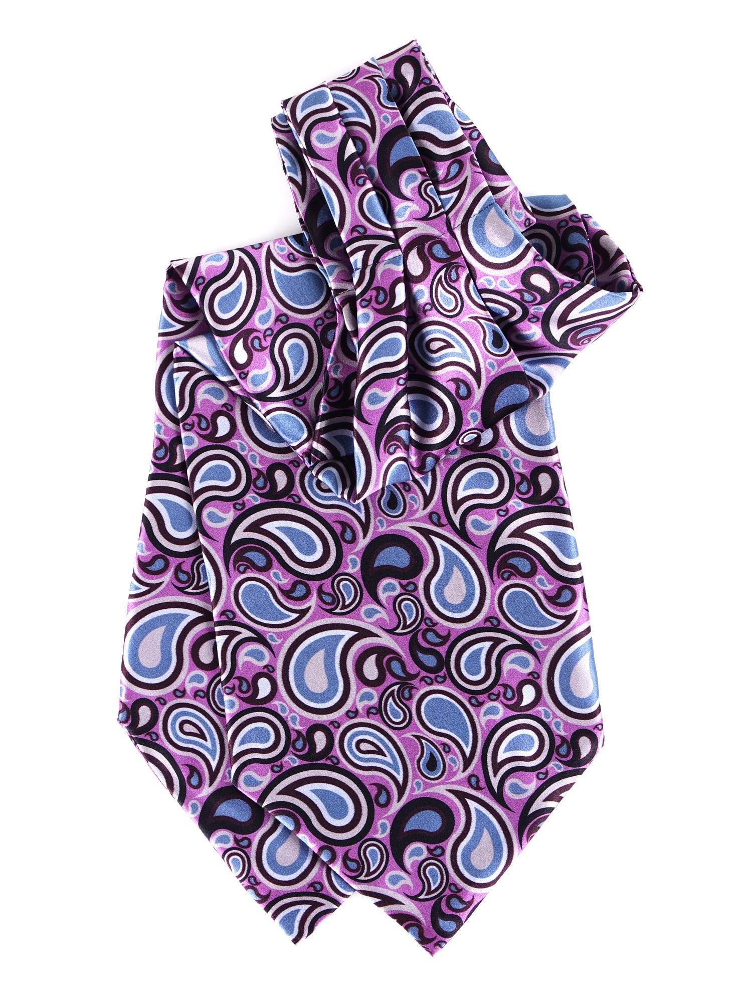 The ultimate expression of the classic dandy and relaxed elegance, this Don Mimì pure satin silk ascot is an accessory designed for the man who is not afraid to stand out. The impalpable softness of satin meets a refined paisley pattern in shades of light blue, brown, and white on a delicate lilac background. It is the style choice for the gentleman who wishes to elevate his outfit with a sophisticated note of color and a touch of aristocratic "sprezzatura", the perfect alternative to a tie for occasions requiring class but less formality.
