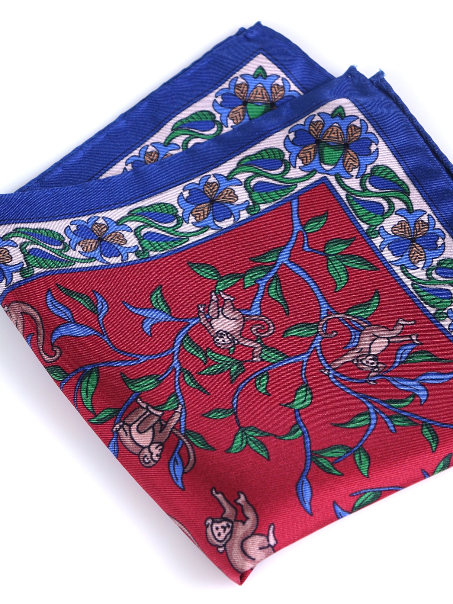 An accessory that is an explosion of color and imagination, designed for the man who is not afraid to dare with style and sophistication. This pocket square is made from pure Italian printed silk, with vibrant luster and a soft, slippery hand. Its design is an immersion into a stylized "jungle": playful monkeys move among vines and exotic flowers, in a bold color palette that combines a vibrant red background with jewel tones like royal blue and emerald green. It is the perfect piece for the man who uses accessories to define his style and express his personality.
