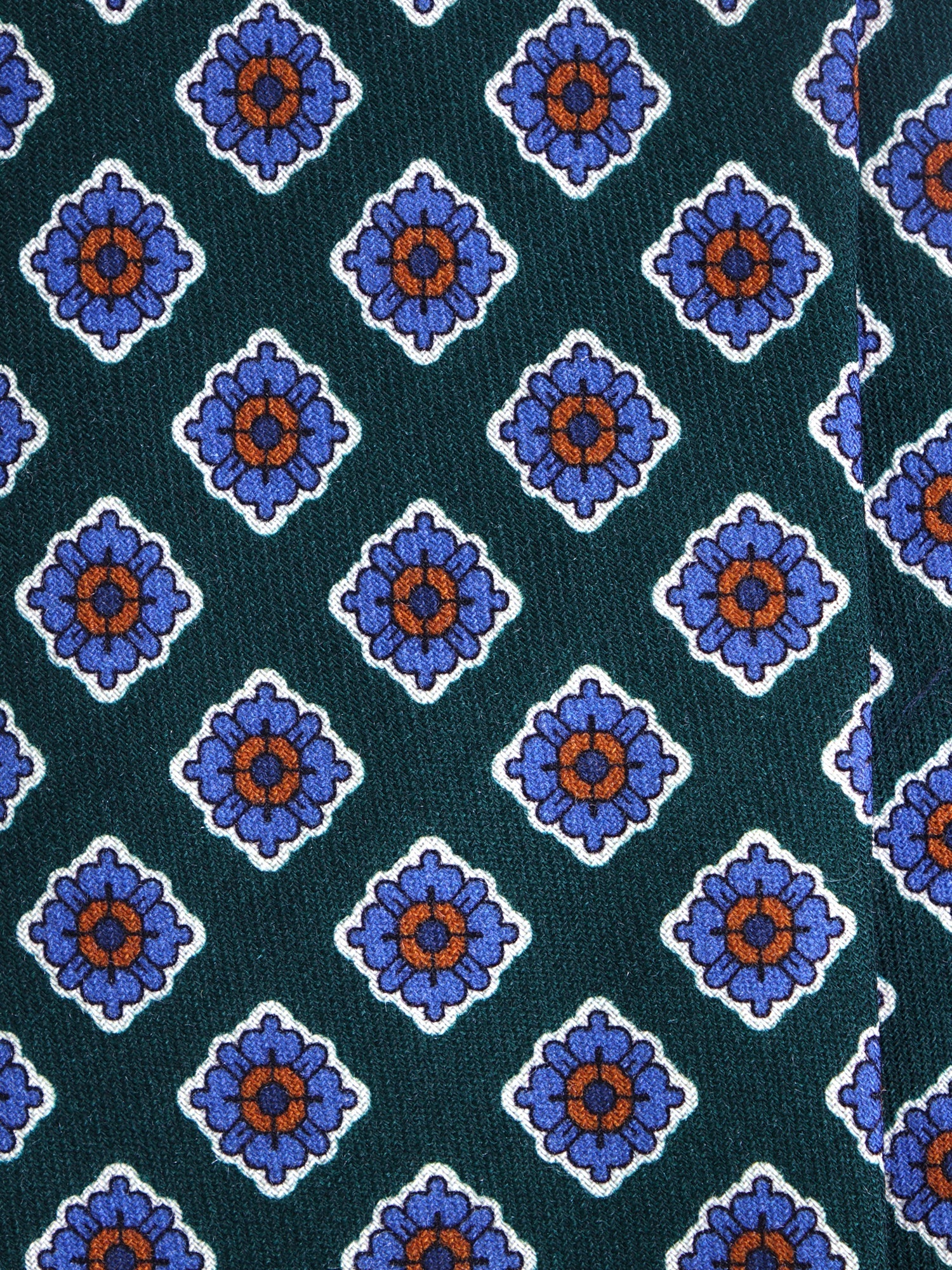 An immersion into the exclusive atmospheres of the English countryside. This Don Mimì 3-fold tie is made from authentic Challis wool, a rare and precious fabric, loved by connoisseurs for its velvety feel, lightness, and matte finish. The deep, aristocratic forest green background hosts a refined medallion pattern in shades of blue and rust. It is the ultimate accessory for the man who favors cultivated elegance, made of noble materials and timeless color combinations.
