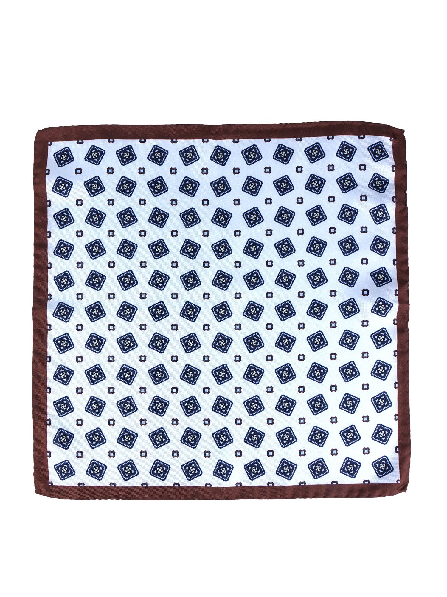 Color: White with blue geometric patterns and brown border
